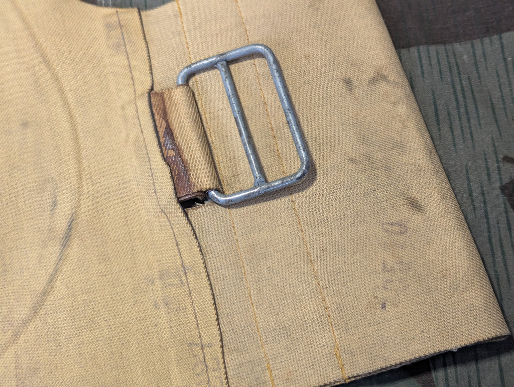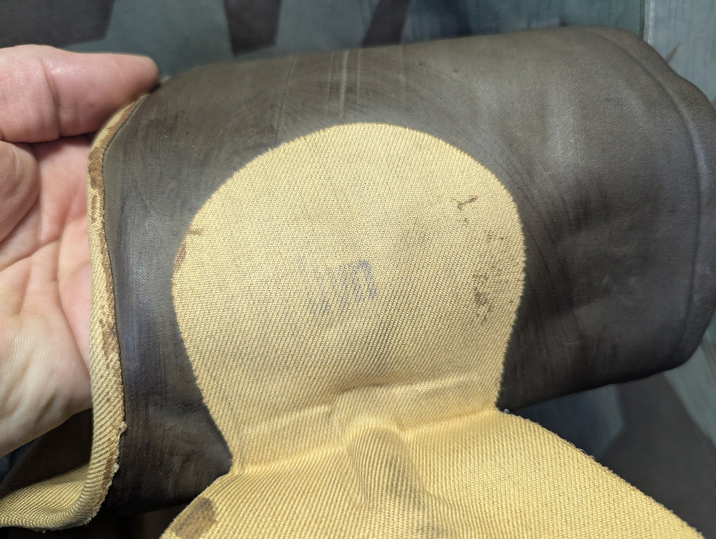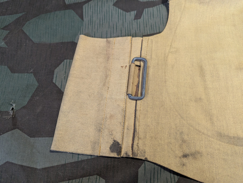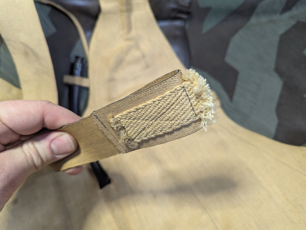Original inflatable Kriegsmarine life vest. Very similar to the Luftwaffe model. The back strap is missing the crotch strap, but it does still have the loop that fits onto the belt. It does display nicely on a mannequin. There is a small slit in the vest which appears to have had tape on it at one time. The rubber is still very flexible and nice. There is some writing on it which looks like S.S.PE  of PF.