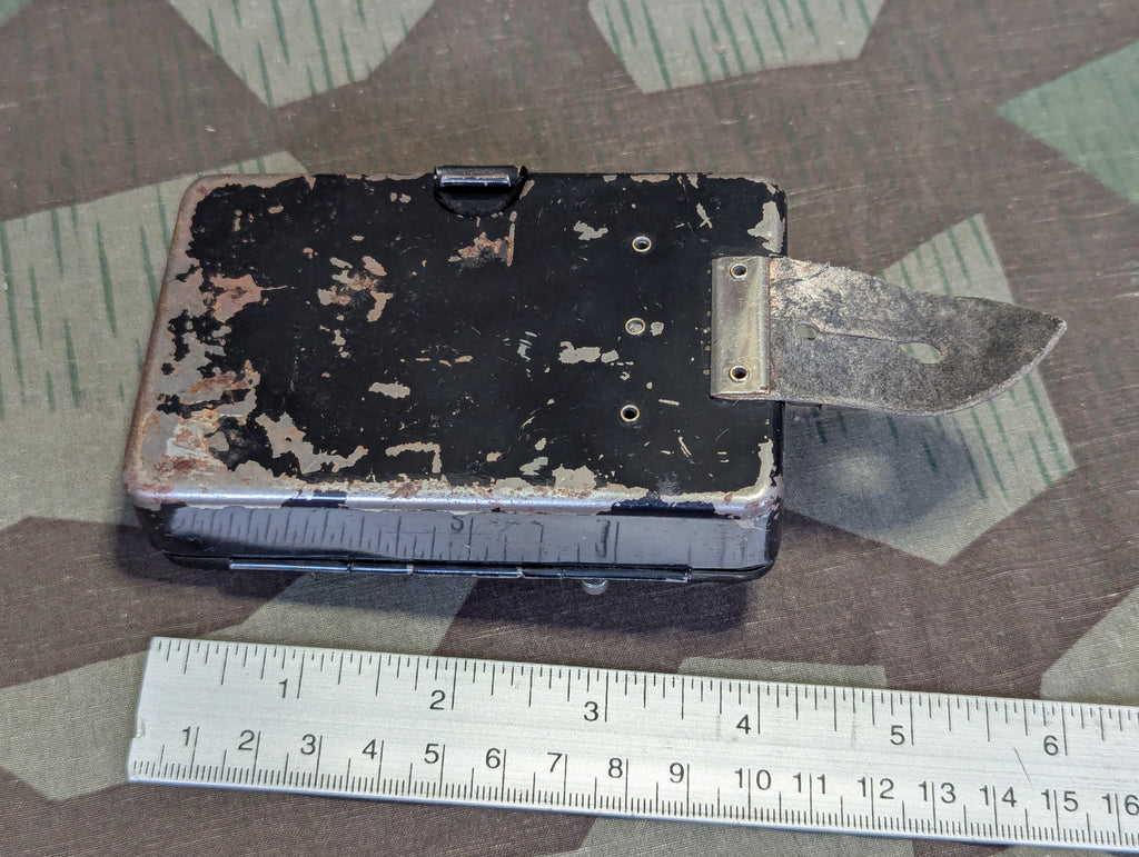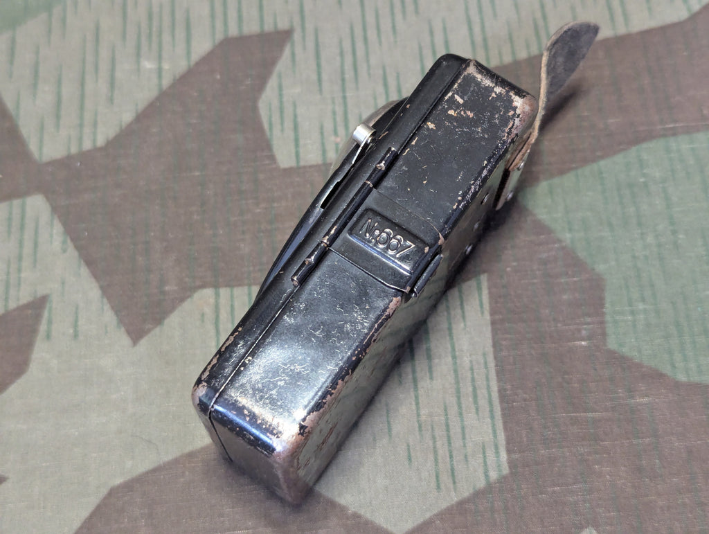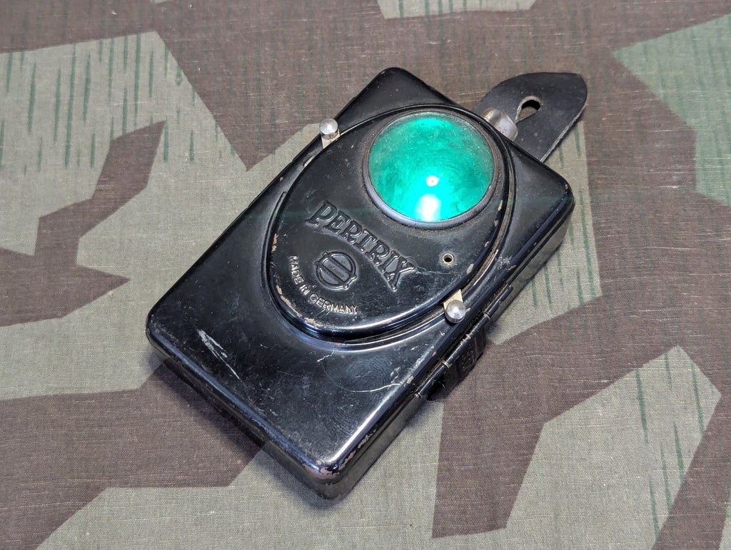 Pertrix flashlight with red and filters. Leather button loop is in decent condition. In good working order with fairly minor wear.