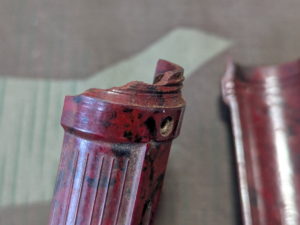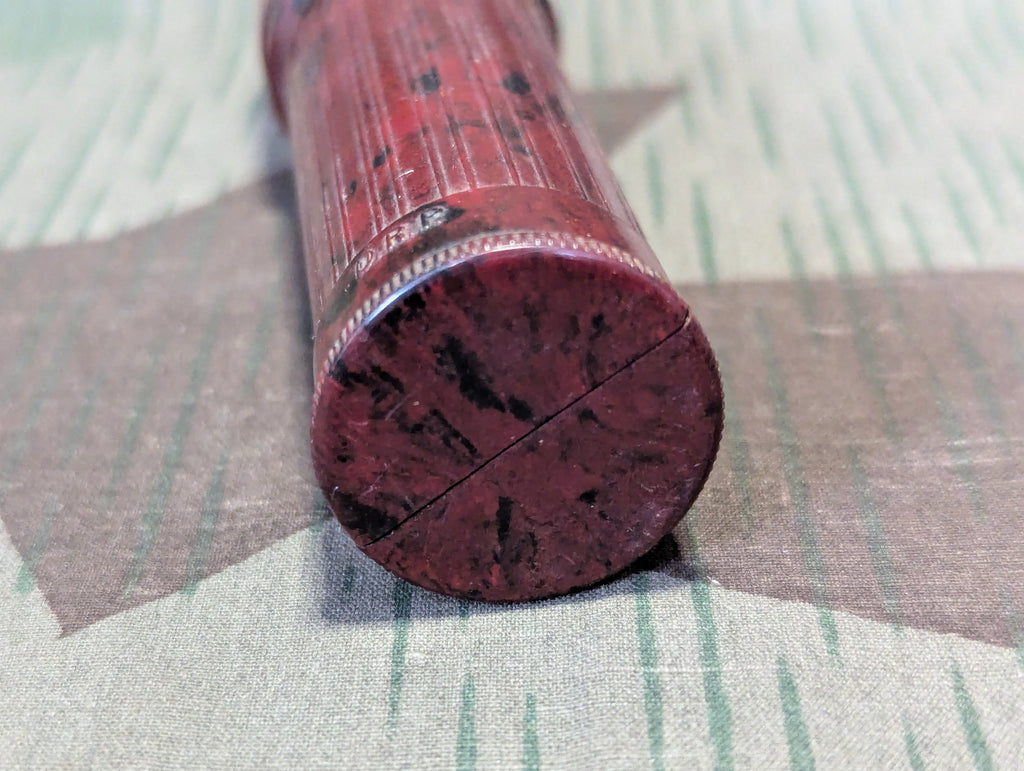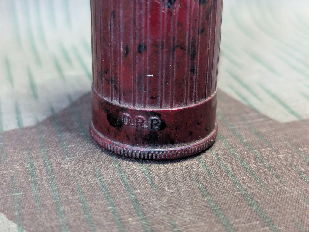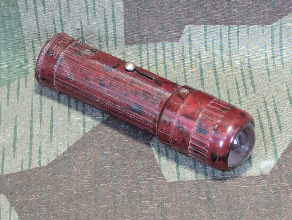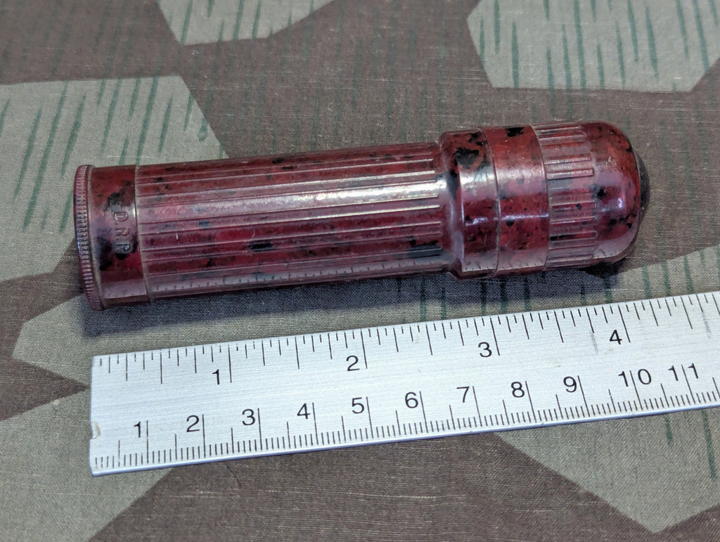 Original Bakelite Zeiler flashlight. In decent condition with one chip on the threaded portion, which is hidden when assembled and doesn't seem to effect function. The Bakelite has an HRS maker mark. The battery this takes is an odd one which is only really available at specialty camera shops.