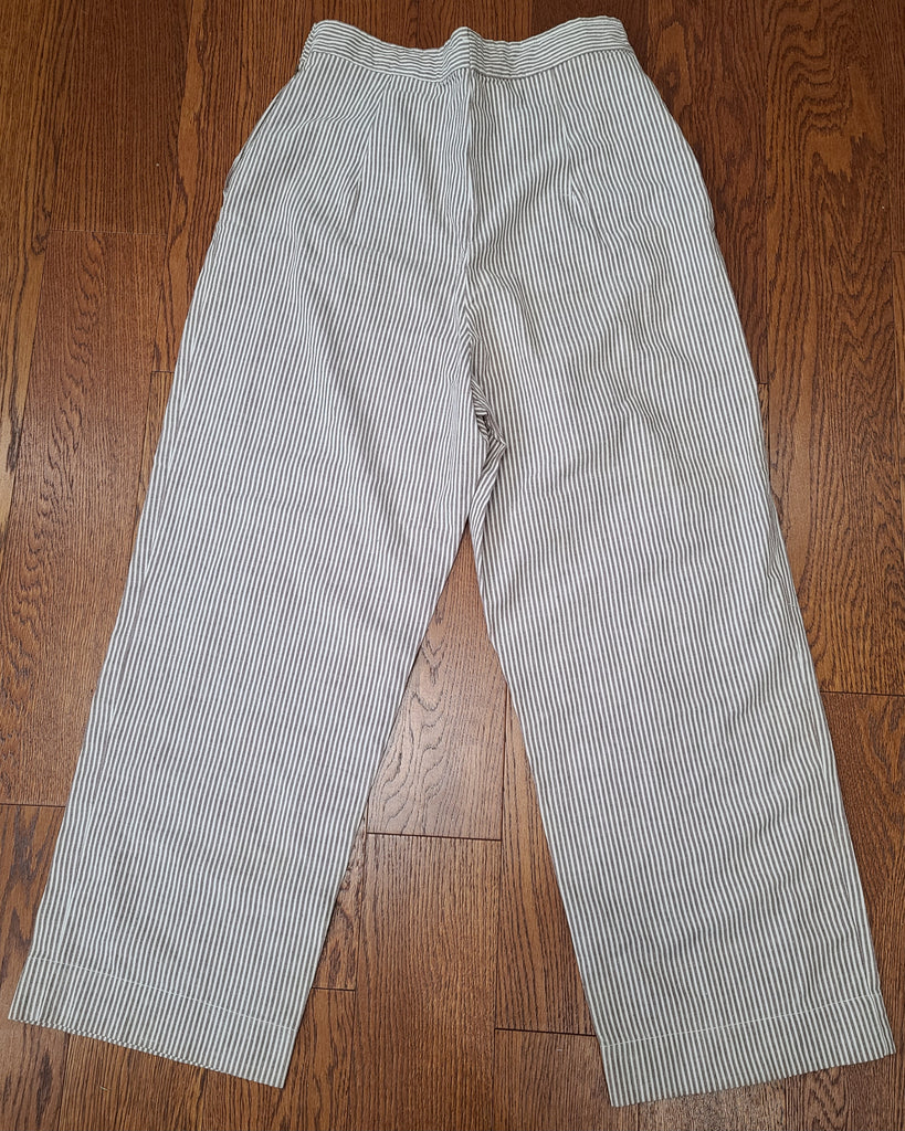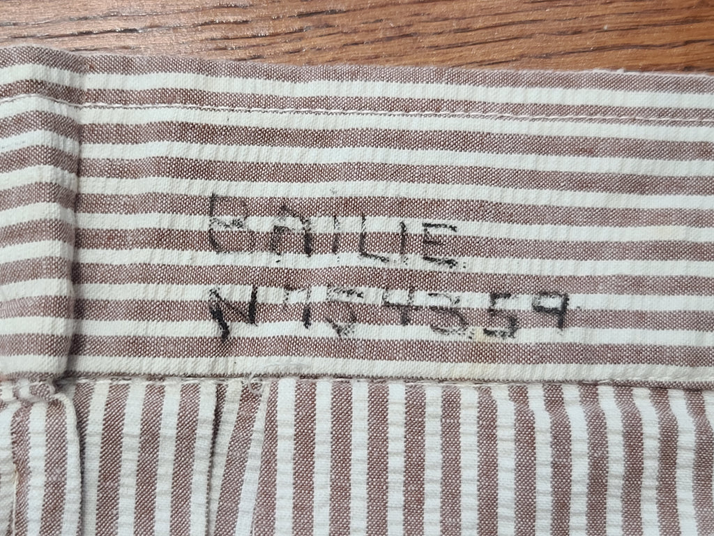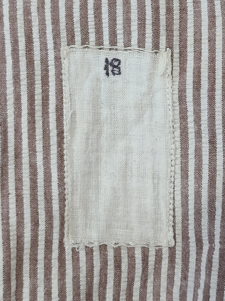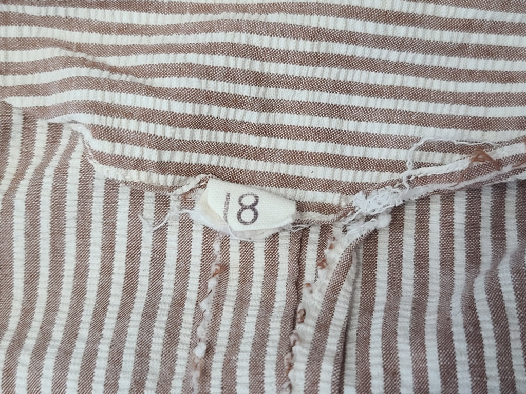Jacket is labeled size 18 (tag is very washed out). Trousers are labeled size 38. Overall fairly good condition. One tiny hole on one sleeve. The trousers have been sewn in and let back out (still some slightly odd stitching). Side metal zipper. Some light staining and scattered brown specks (the stripes do hide it quite well). There are some pulls in the material There is a name and serial number written inside the pants "Bailie N754359". Nothing written in the jacket.