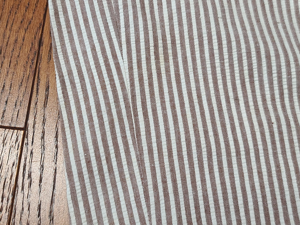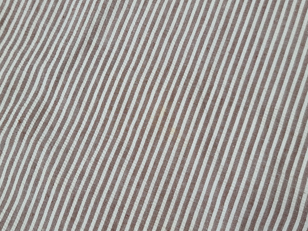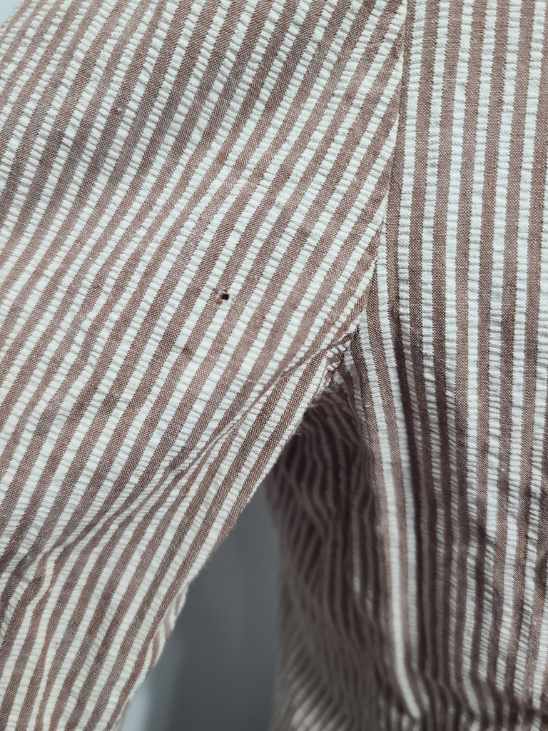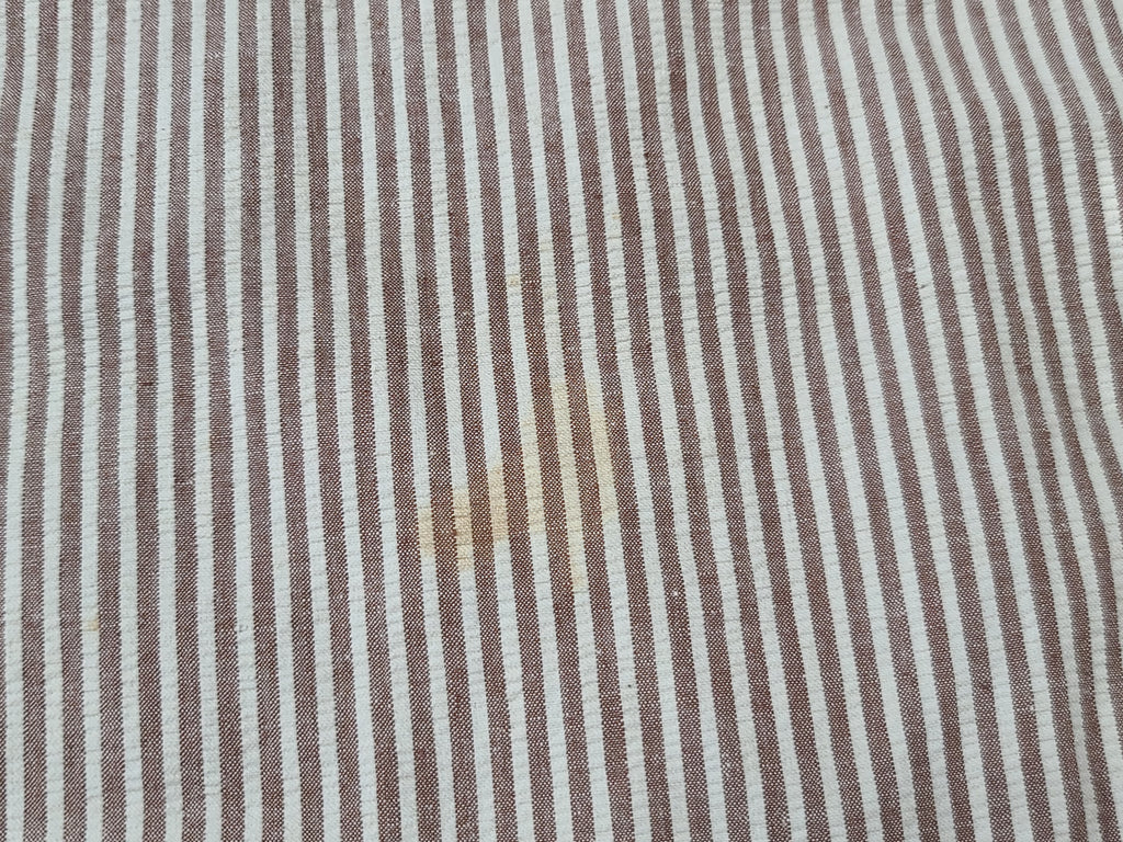 Jacket is labeled size 18 (tag is very washed out). Trousers are labeled size 38. Overall fairly good condition. One tiny hole on one sleeve. The trousers have been sewn in and let back out (still some slightly odd stitching). Side metal zipper. Some light staining and scattered brown specks (the stripes do hide it quite well). There are some pulls in the material There is a name and serial number written inside the pants "Bailie N754359". Nothing written in the jacket.