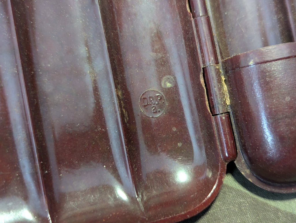 Original 1936 dated, D.R.P.ang marked Bakelite cigar case with a gold colored inlay for Göschwitzer Portland Cement, celebrating their 50th anniversary (1886-1936). There are two small cracks on one corner. It is still usable; it opens and closes fine, but it is not as tight of a seal on that corner. General wear and scratches. The hinges inside have some small chips, but nothing that effects function.