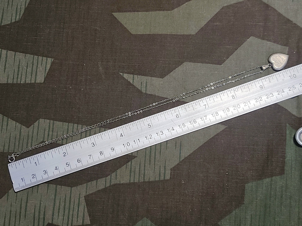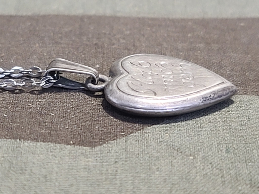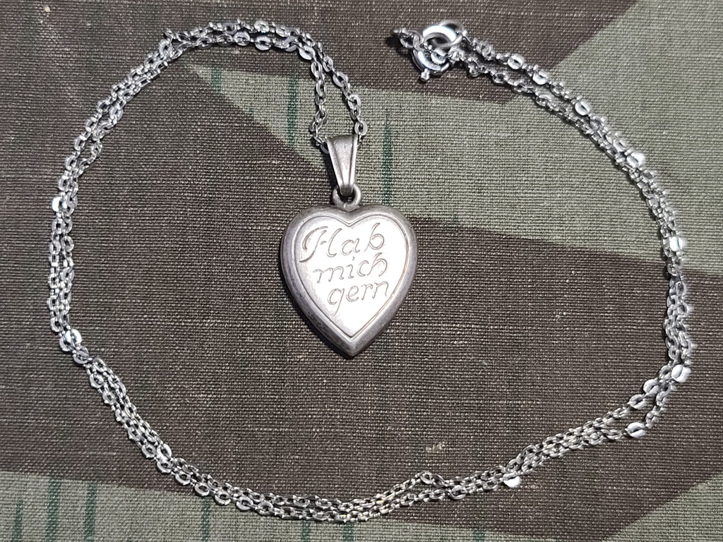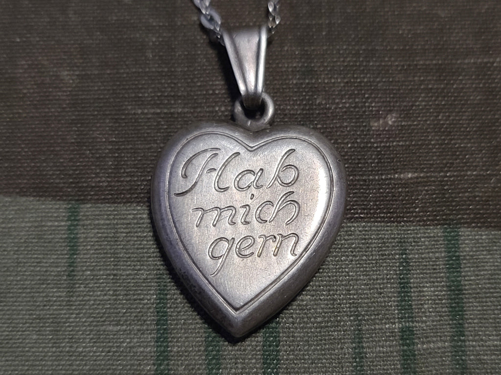 Vintage German "Hab Mich Gern" ("Have Me Happily") silver heart necklace. It is marked 835 on the loop attaching the charm to the necklace. There are some letters after the 835, but it is hard to make them out (K __?). Good condition with light wear.