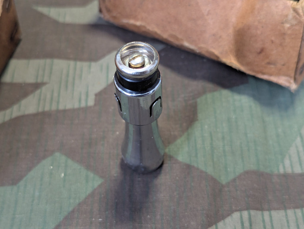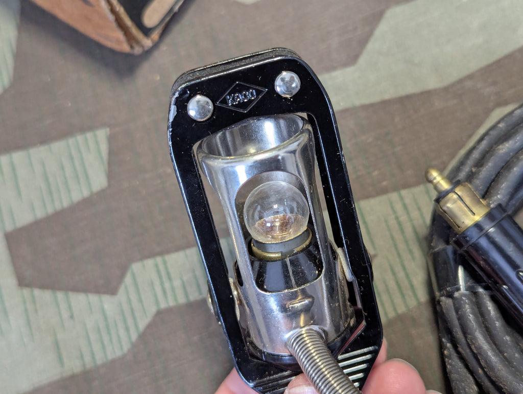 Original "new" in box German clip on work light for cars. Marked DRP and the brans name Kaco. This was made to plug into standard German dash plugs, not exactly a cigarette lighter plug, but similar concept. This is in very good condition just a little dirty from 80+ years of storage. The cord is still rolled up and taped into a coil. I do not know if the tape is how it was originally packed, so I didn't want to open it up.