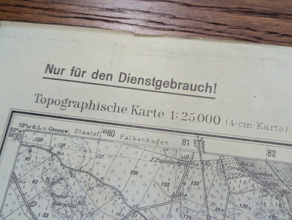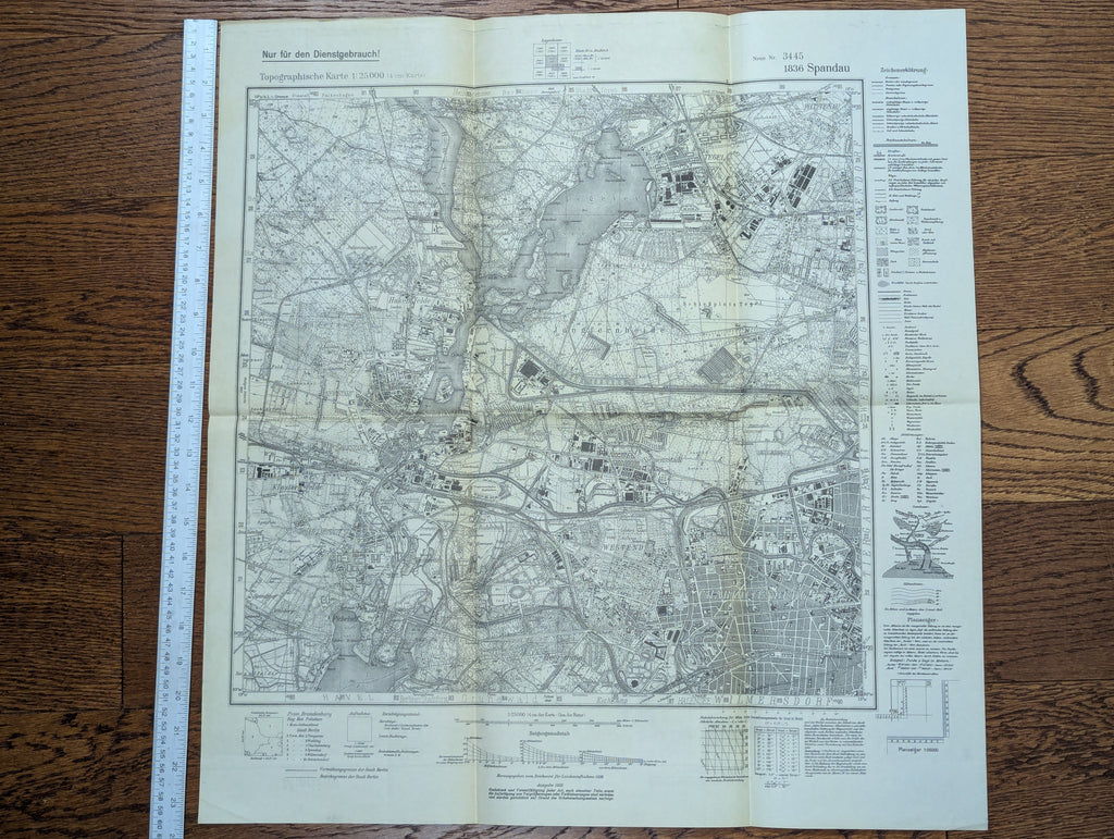 Original recycled late war German map of Spandau in Berlin printed on the back of an earlier map of Miadziot in northern Belarus near the Lithuanian boarder. The price is for one. We have a few as they were unissued and all are in similar condition. I did buy these in Berlin. There is some cosmic irony in maps printed for the defense of Berlin being printed on maps originally made for the invasion of the Soviet Union.