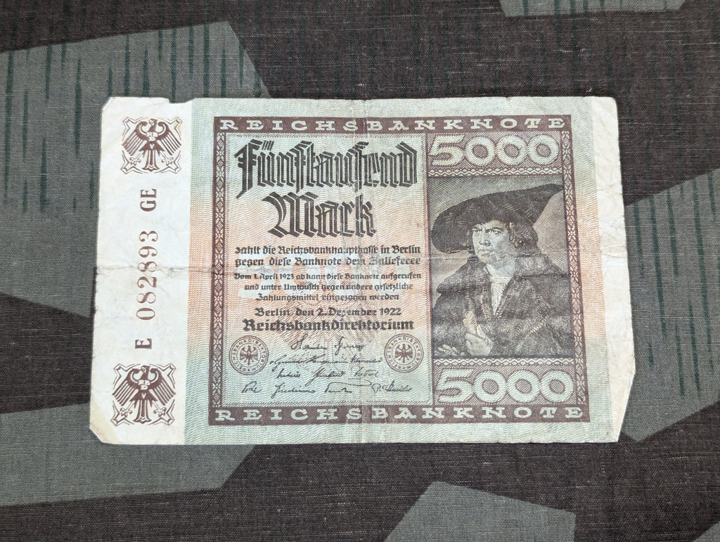 Original 1922 5,000 Mark Reichsbanknote. In circulated condition with lots of wear.