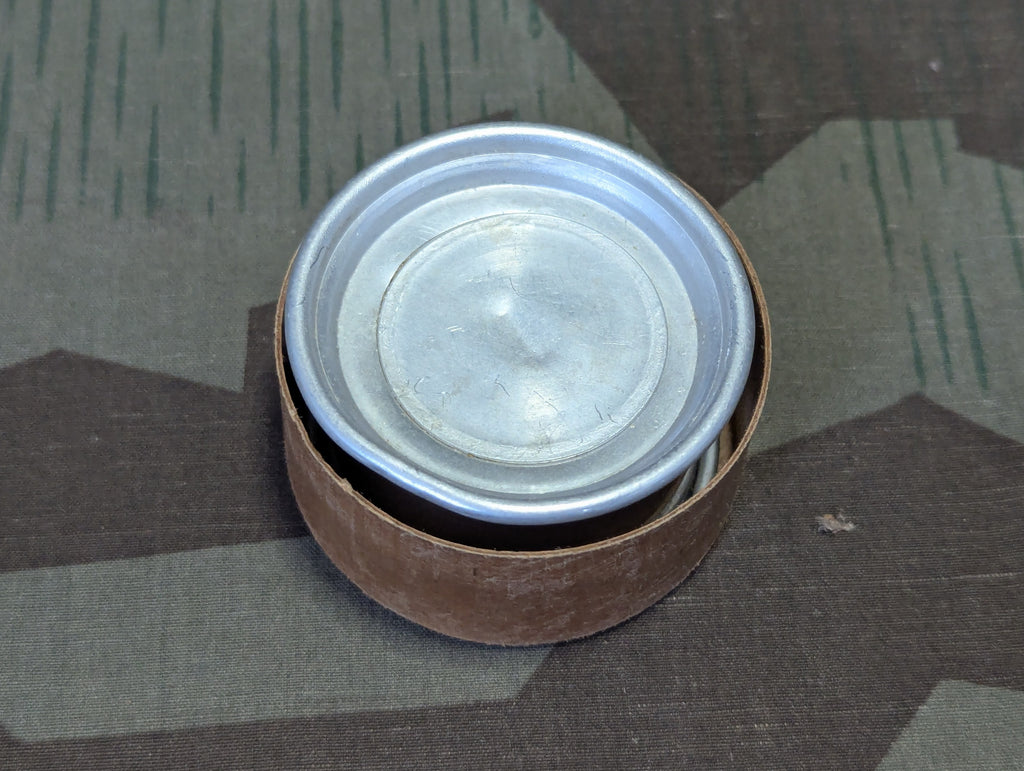 Nice period German aluminum folding or collapsible cup with a paper container. No markings. Fairly good condition with light wear and some small dents. Needs cleaned.