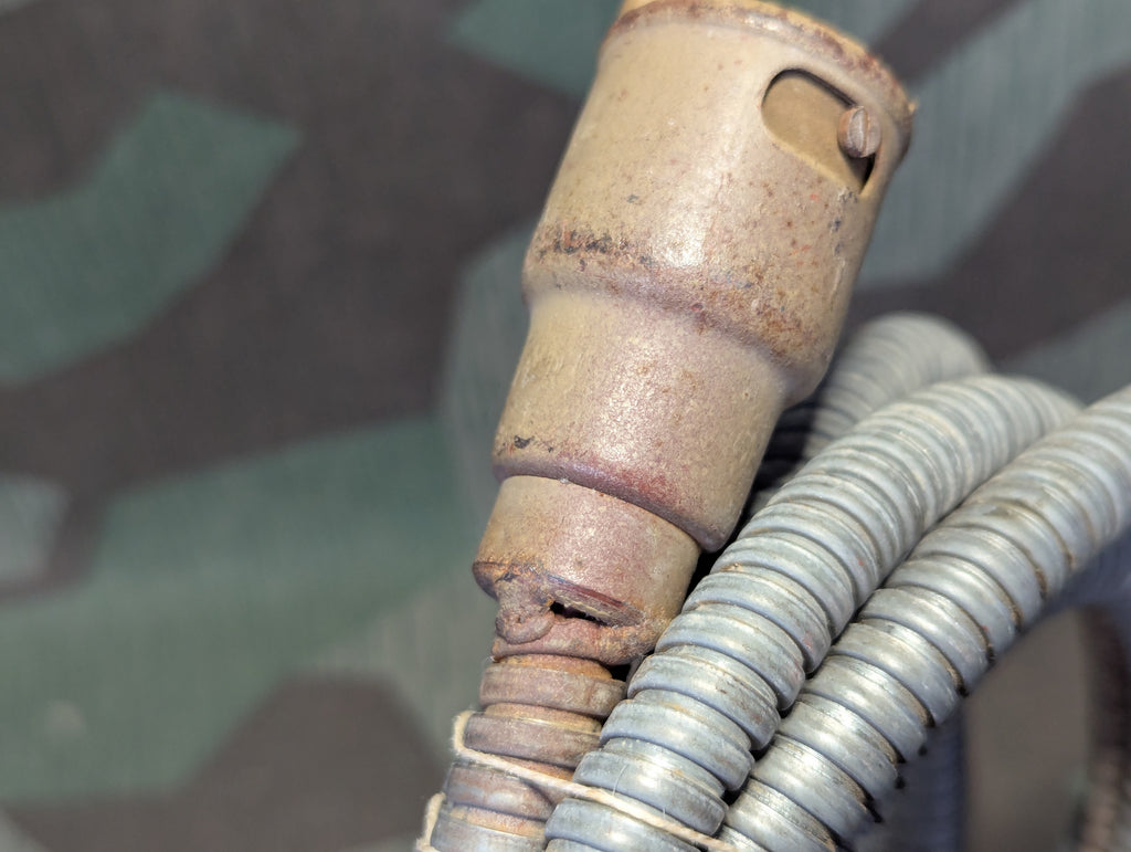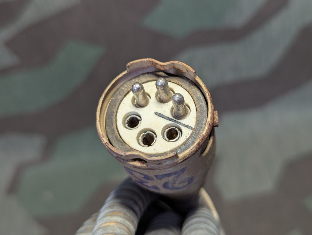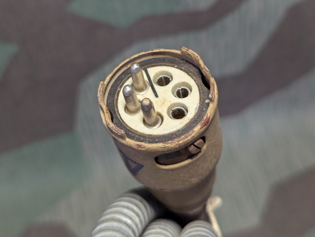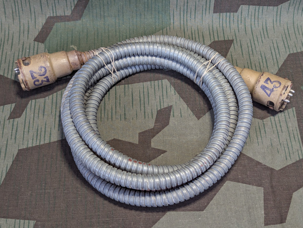 I obtained this cable along side several related communications bits which were all recovered from a FLAK battery in 1945. After much research, I was not able to establish exactly what this cable is for. It is likely part of the communications or targeting set up for the late war interconnected battery and the plug style is very similar to others I have found that were identified as part of the kommandogerät targeting equipment, but this only has 3 prongs and 3 sockets. The other cables tend to have a lot more than this, but they are made in a similar style. It is crudely made, but extremely in line with what was being churned out in the last months of the war. I think this was probably a power supply cable for one of the targeting devices but that is my best guess. It is in good condition with some corrosion on some of the cable shielding. The plug ends are painted tan over red oxide primer. One end is stamped 23 and the other end is stamped 43.