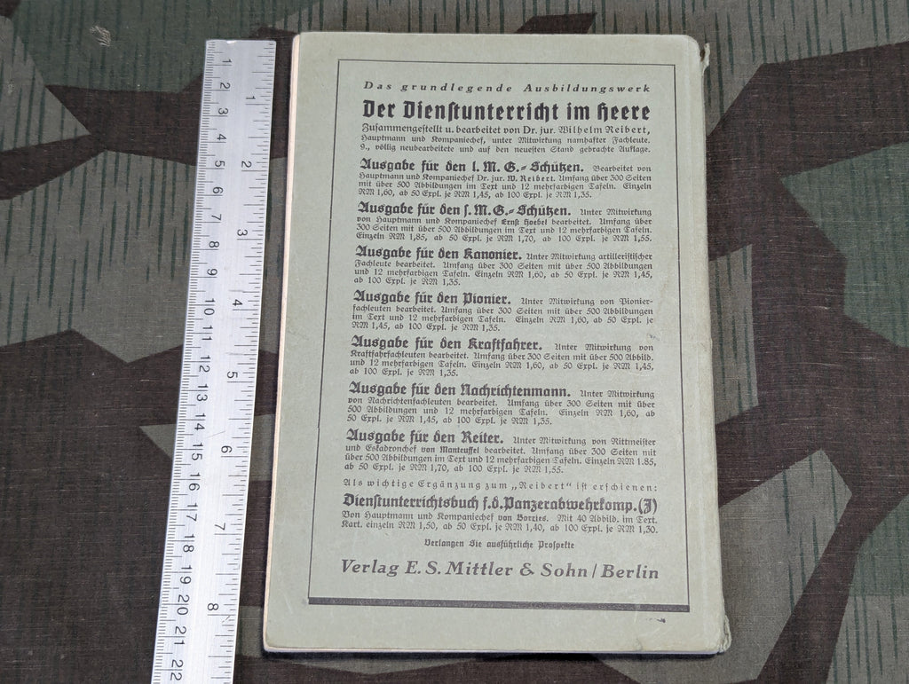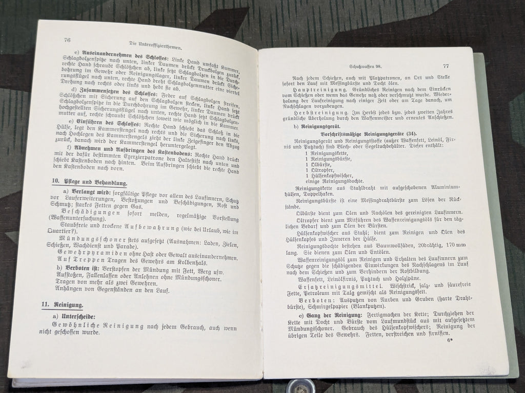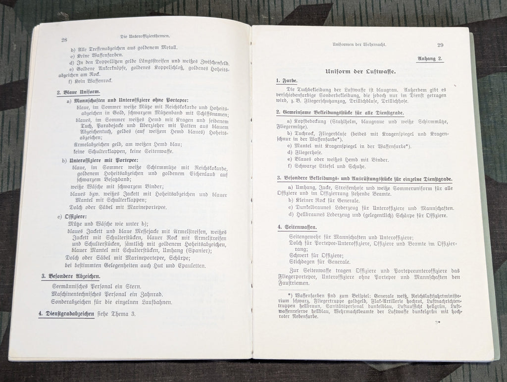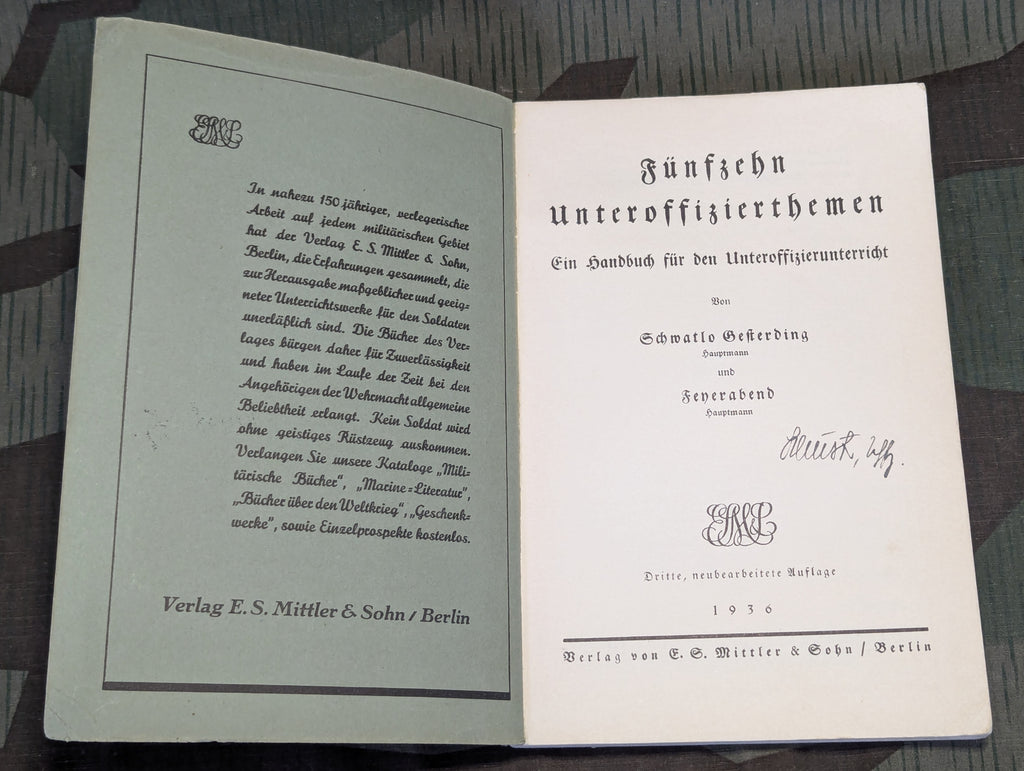 Fünfzehn Unteroffizierthemen "Fifteen Non-Commissioned Officer Topics: A Handbook for Non-Commissioned Officer Instruction" book from 1936. A signature on the first page. Some wear along the spine.