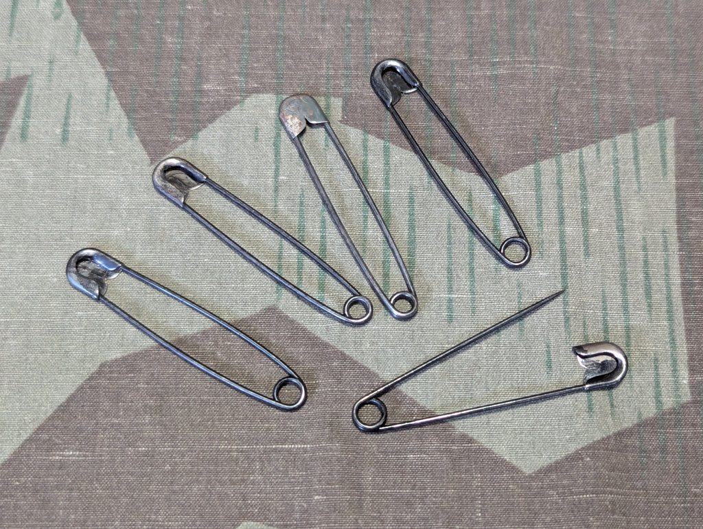 Period correct vintage German safety pins in black. Wartime safety pins are different than modern pins in that one side of the end is a solid piece. They do not make safety pins like this any more or at least not that I can find; perfect for the detail-oriented reenactor. They are a slightly larger size, measuring approximately 2" long.
