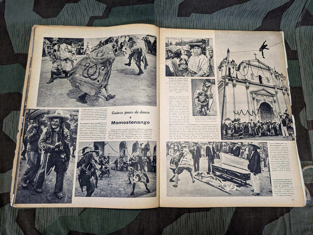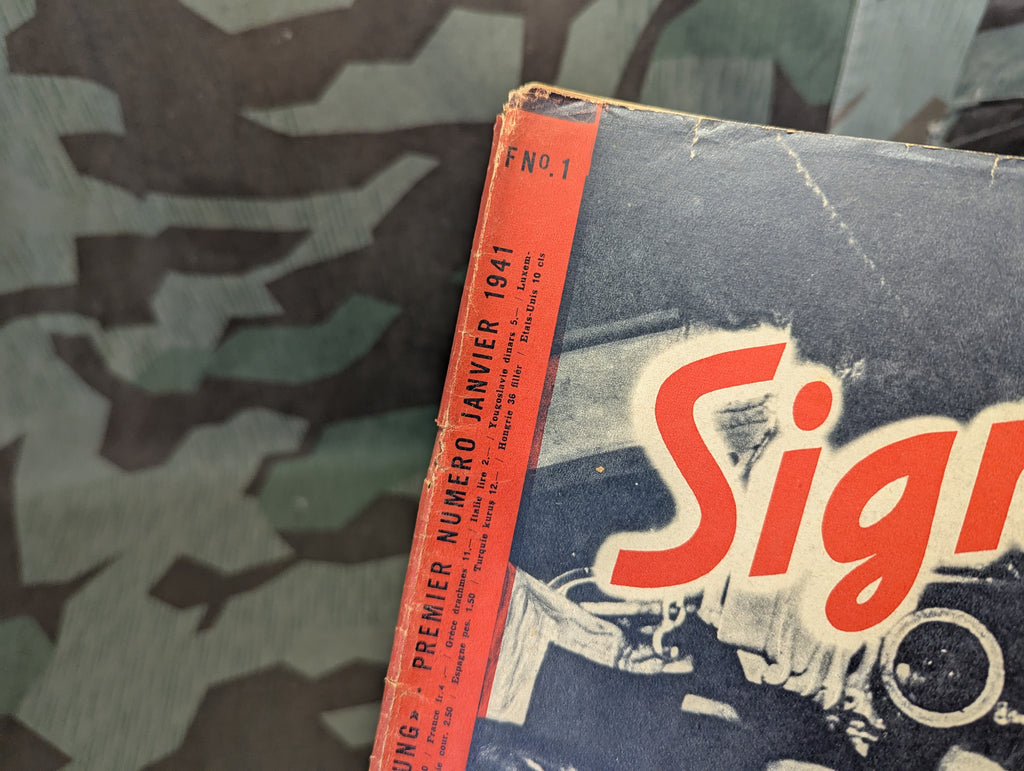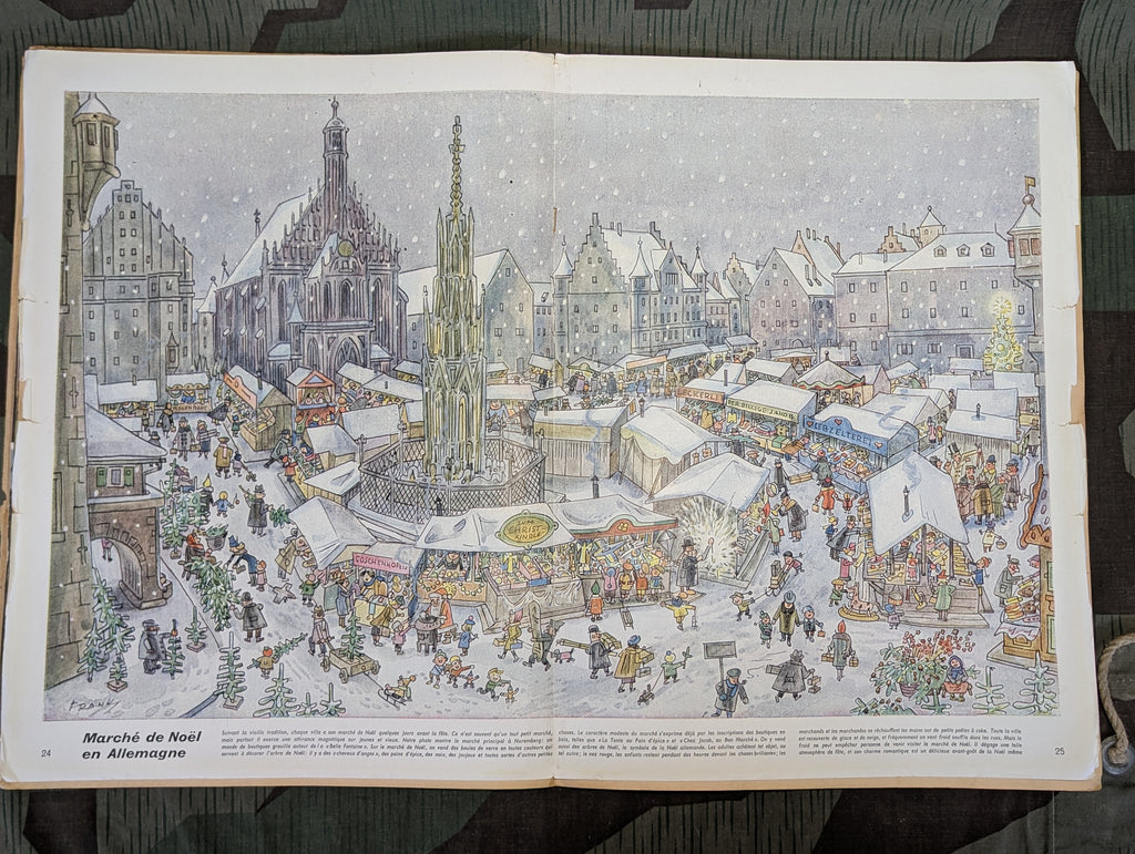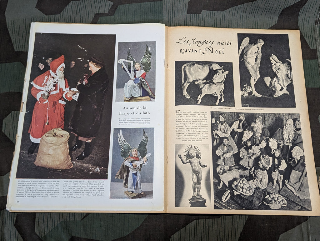 Original January of 1941 Signal magazine in French. Nice Christmas cover. Another nice issue of Signal with a number of good color pictures and some very good ads. The center color page is loose. May ship slightly rolled.