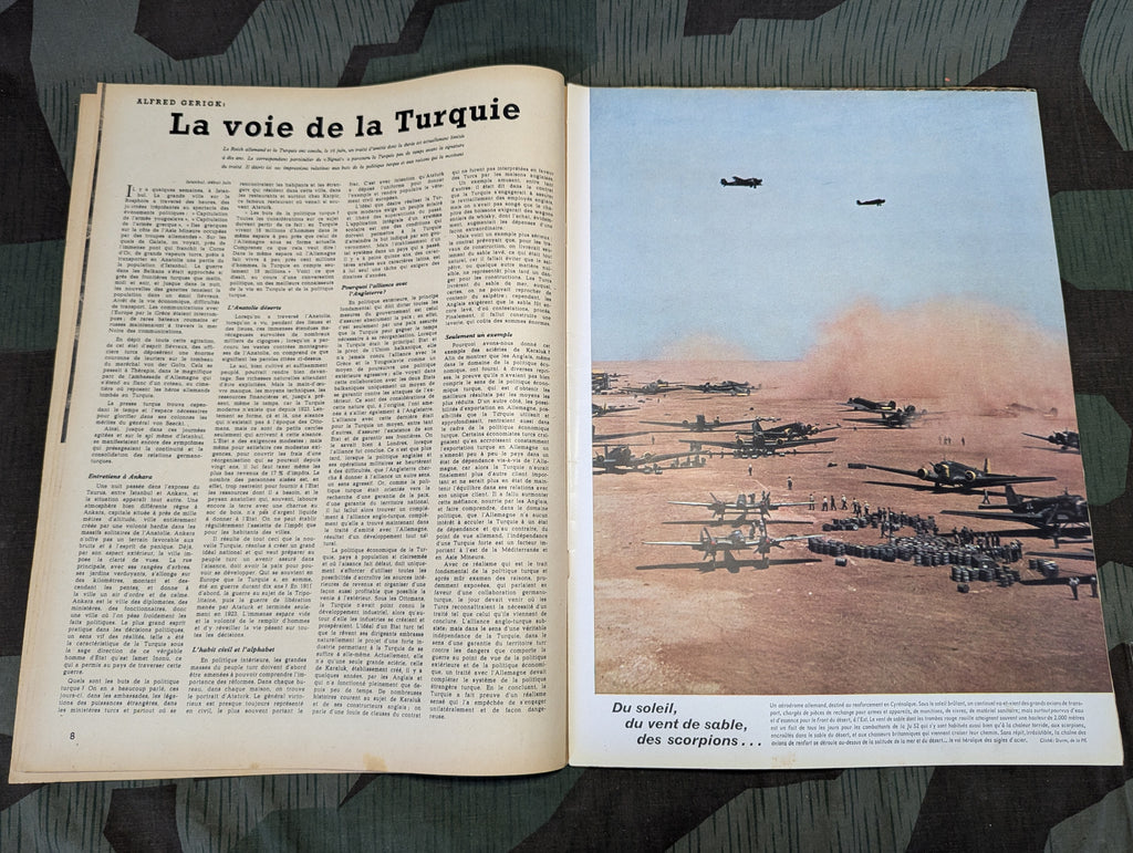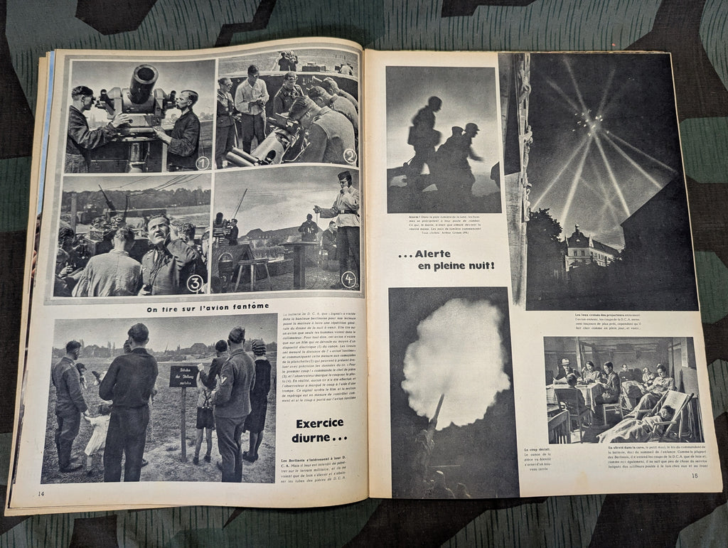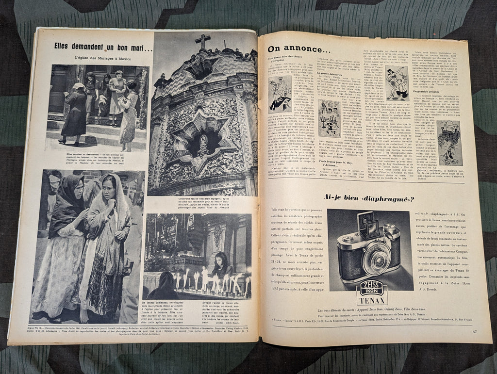 Original July of 1941 Signal magazine in French. Another nice issue of Signal with a number of good color pictures and a lot of very good ads. I found flipping through this one to be a bit more interesting than most. Lots of nice photos with some good flak shots and SS MG pictures. In fairly good condition overall. The center page is loose, like always. May ship slightly rolled.