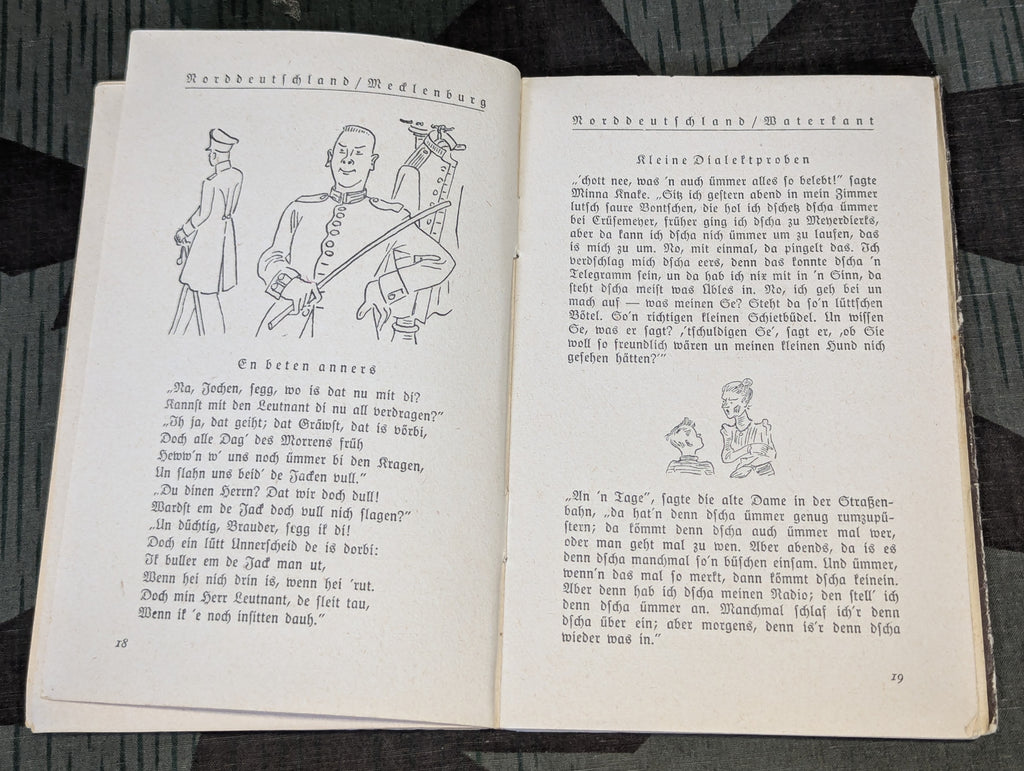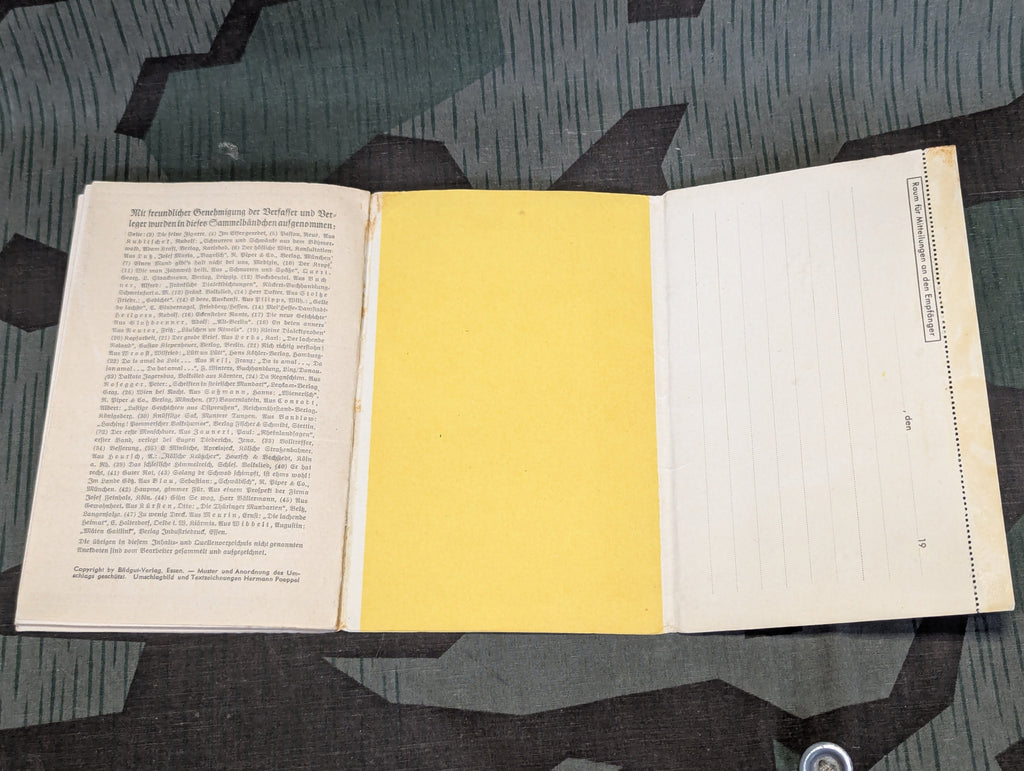 Lachendes Deutschland humor book. The back cover has a feldpost card flap - you can wrap it over cover and send it via feldpost. Innovative way to spend a book without it getting damaged as much. OK condition. Some wear and separation along the spine. I did not see a date.