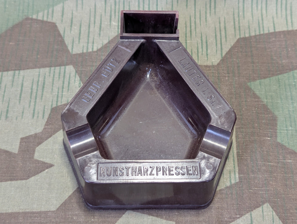 Original deadstock Bakelite advertising ashtray with a little holder for a box of matches. This was found along with a number of other deadstock stuff all from this same company Gebrüder Götz. All of the items were pre-war 1930s. Good condition.