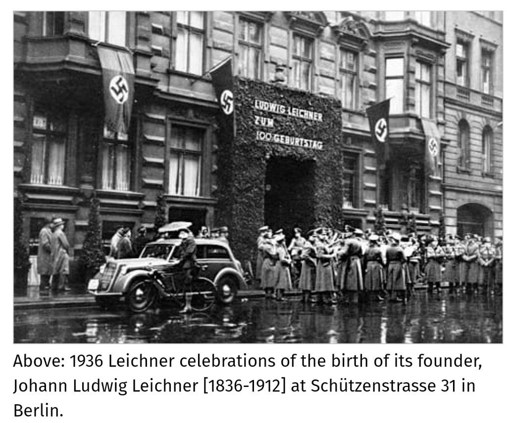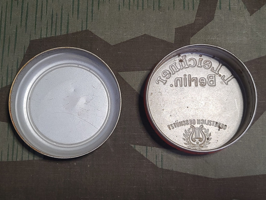 Pre-war German L. Leichner's Abschminke make-up removal cream tin. It is empty, but still smells a little perfumey when you open it. Leichner was a big name in cosmetics and was popular as both professional make up in movies and theater and as well skincare and make up for everyday women. They had a presence in both Germany (Berlin) and in England (London) during the war. The address in Berlin was destroyed by bombing, so this helps to date the tin. Some wear and light rust.