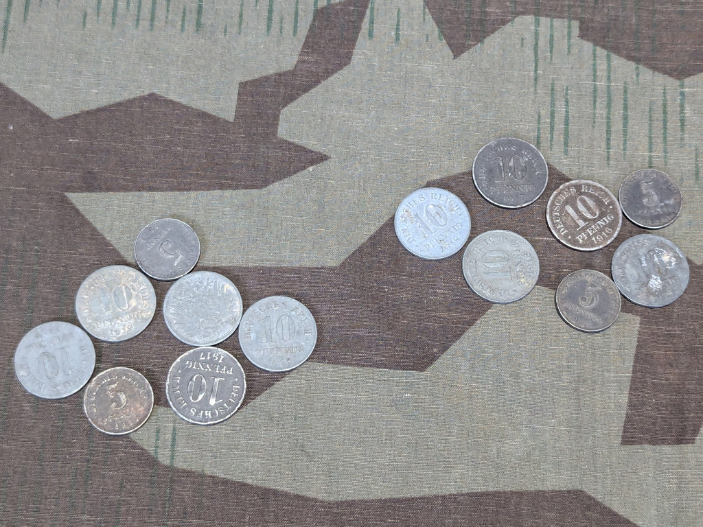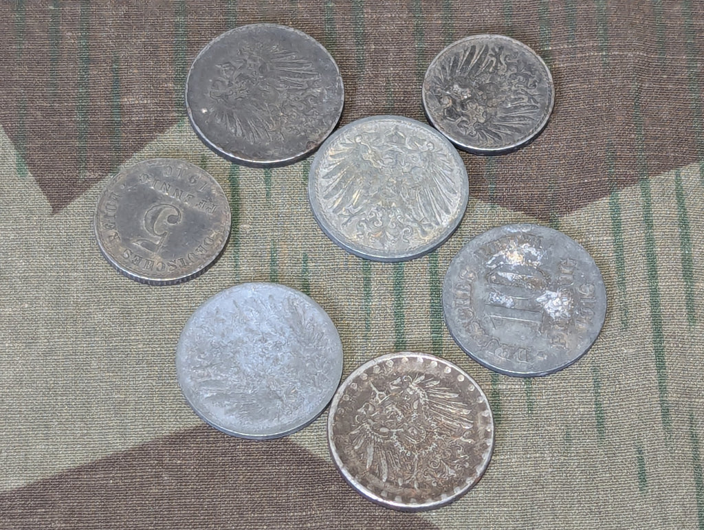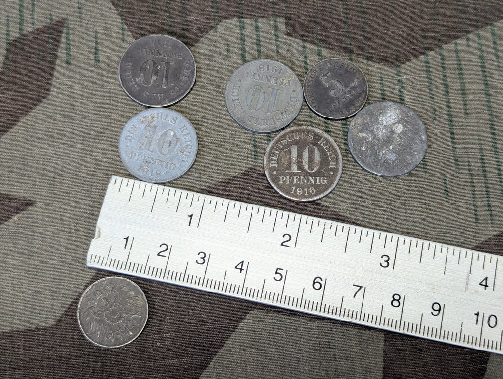 Lot of 7 WWI era German coins. 5 and 10 Pfennig coins in heavily circulated condition. Dates range from 1916 to 1918. There is one or two in there that were so worn, I couldn't tell if it was 1918 or 1919. We only have two lots available.