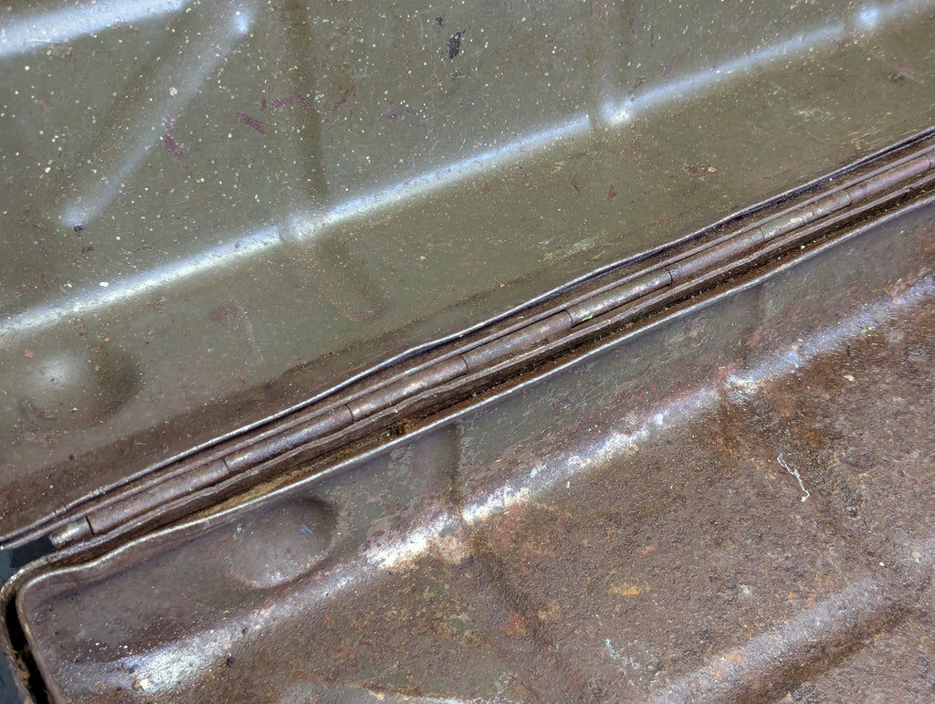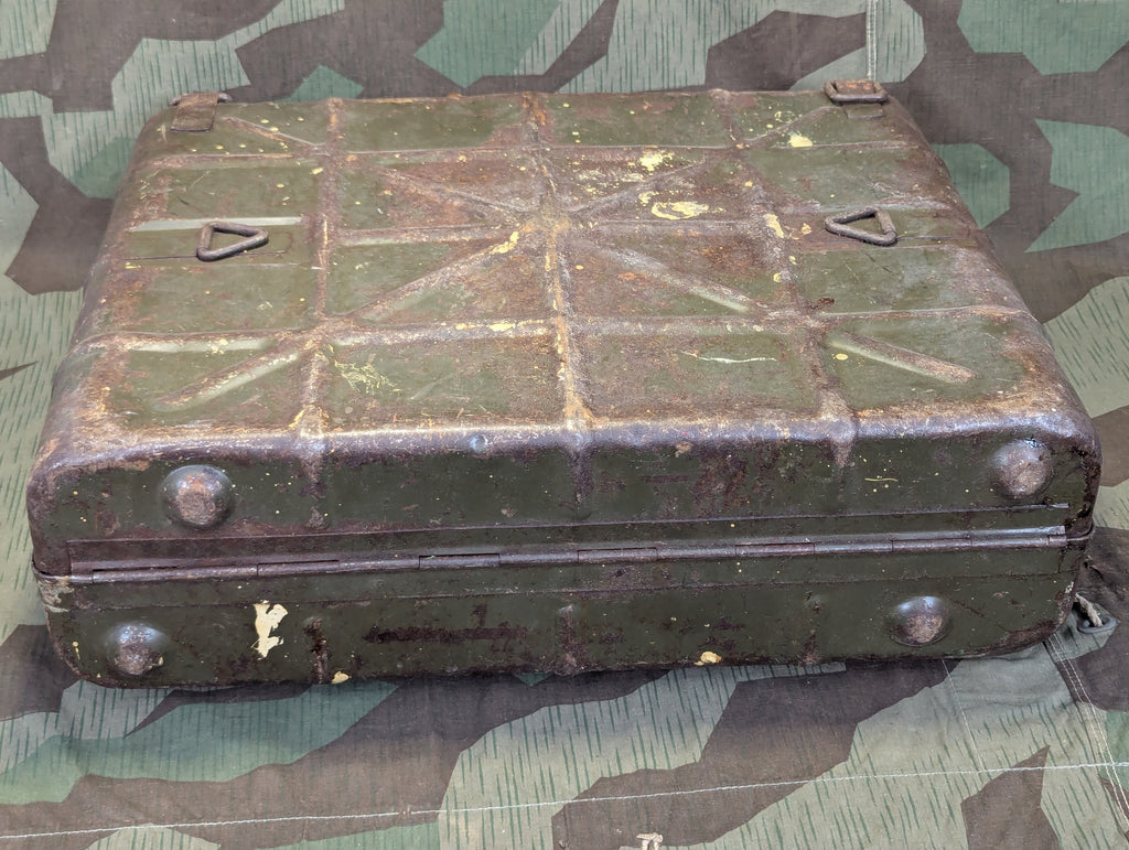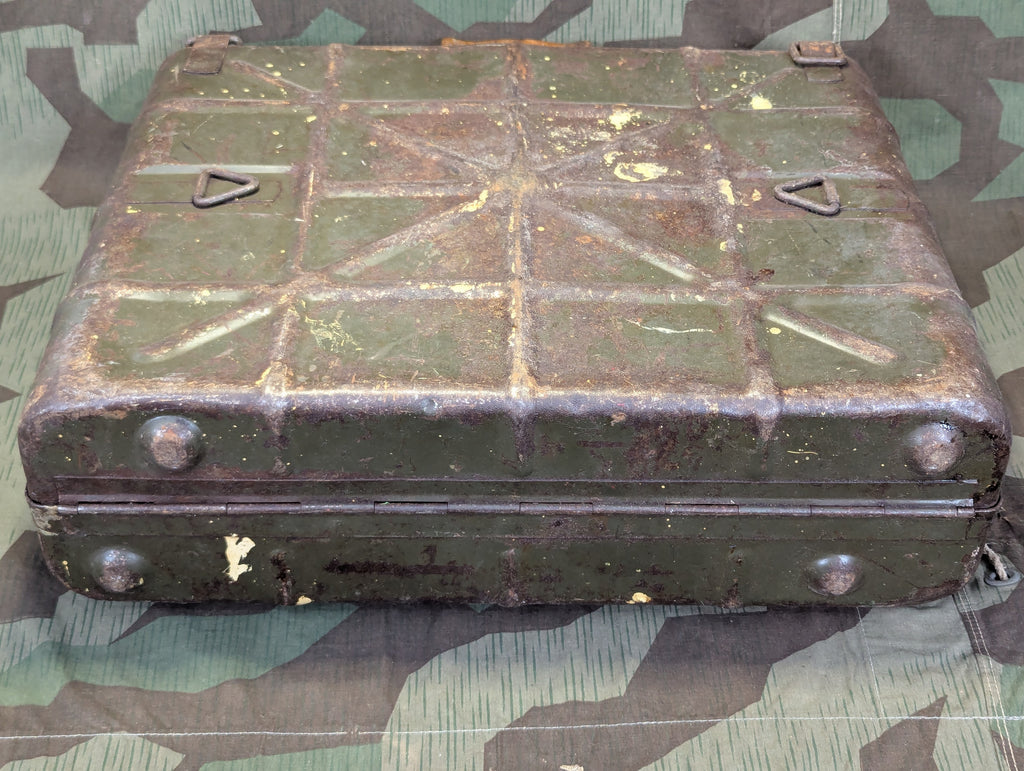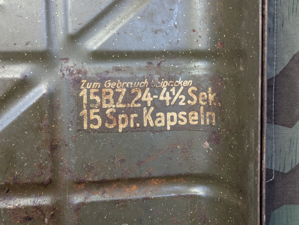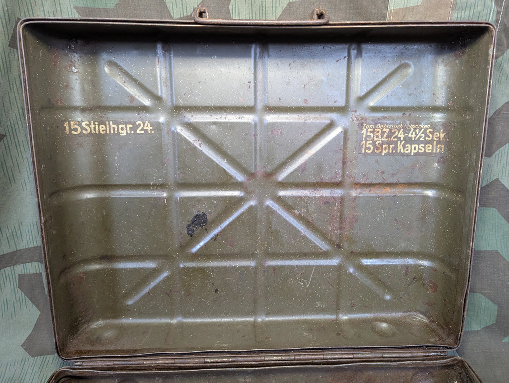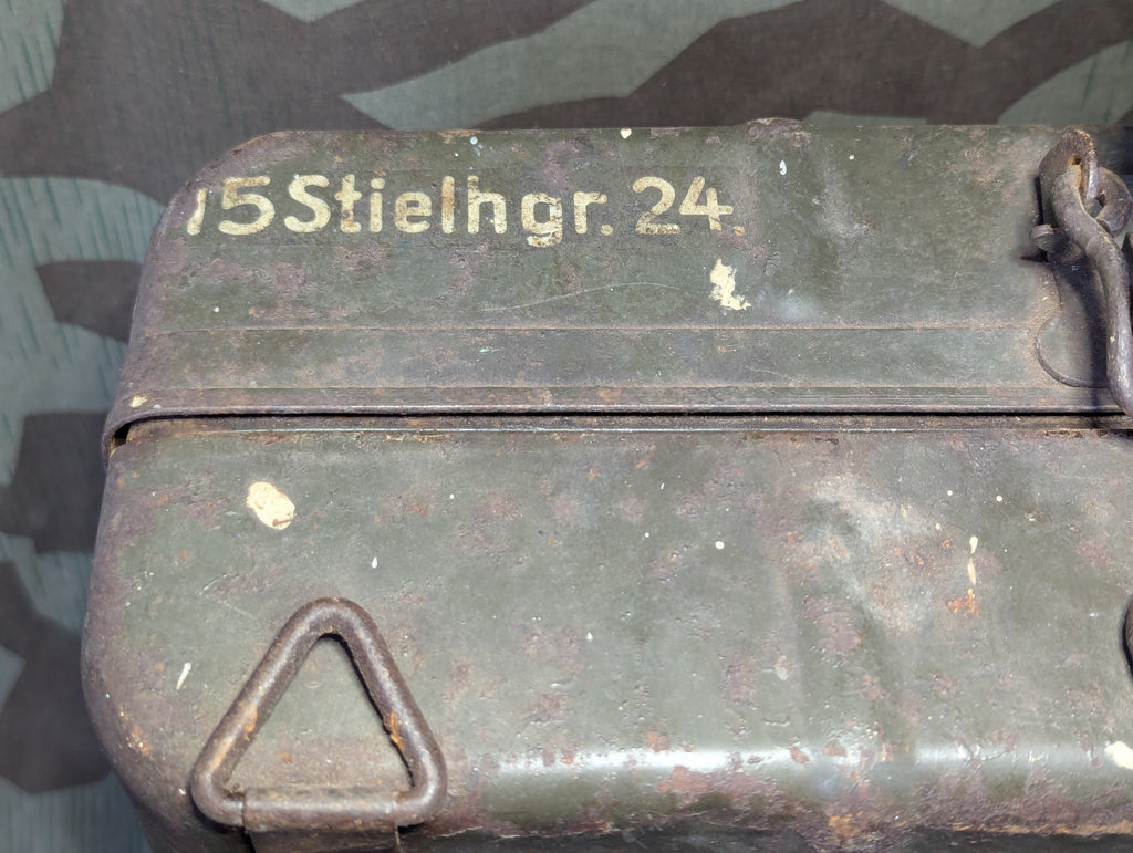 Original steel stick grenade carrying case in rather good condition. The hinge is solid and nice. The body isn't excessively beat up, warped or dented. It has some surface corrosion but no through holes. The stencils are still pretty decent. The wood handle is nice. This is just an all around good solid case. It falls into a middle ground of restoration or leaving it as is. Either is probably an acceptable outcome as long as the restoration is done well.
