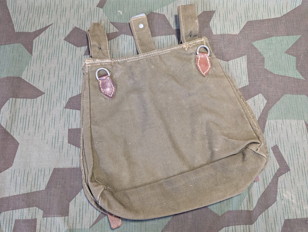 Decent example of a mid war bread bag. There are no markings, but it is still using brown leather, is made from the war time olive material, and lacks the leather reinforcements on the belt loops so its probably from around 1941-42. It is a very nice looking bread bag with one notable flaw: one of the closure straps is ripped at the second button hole, see pictures. This is still a collector grade bag, ideal for a mannequin or even for filling a gap in your collection.