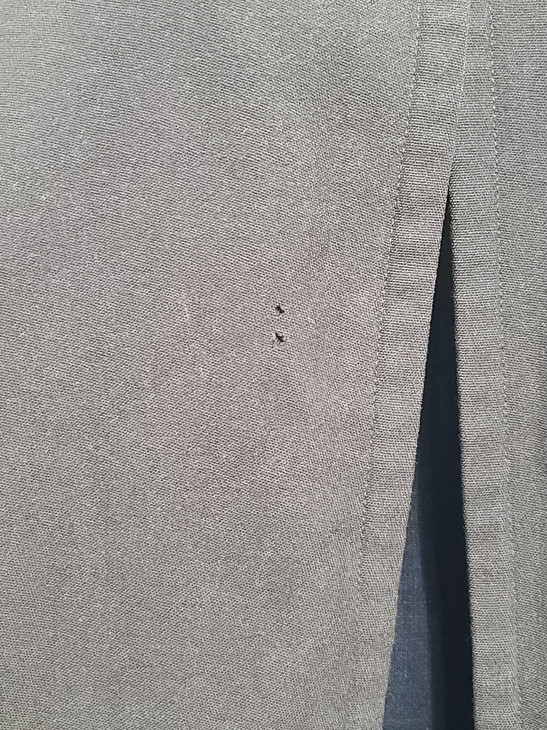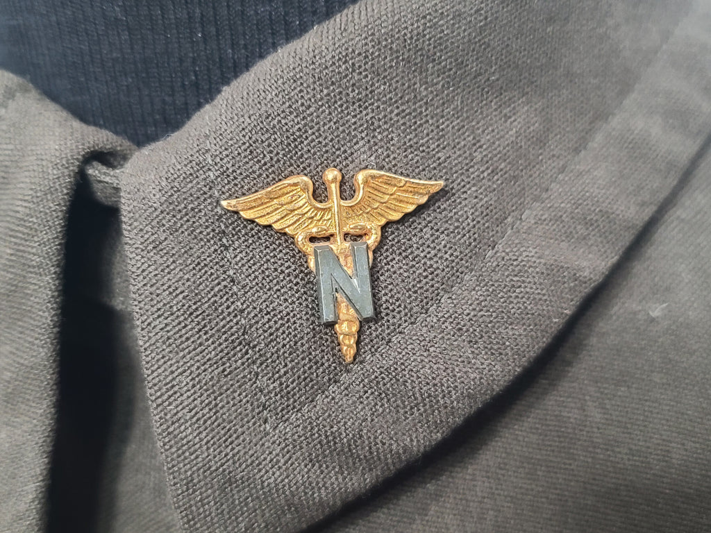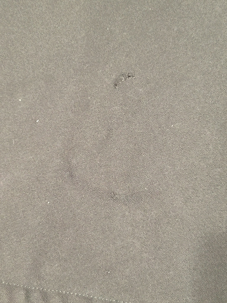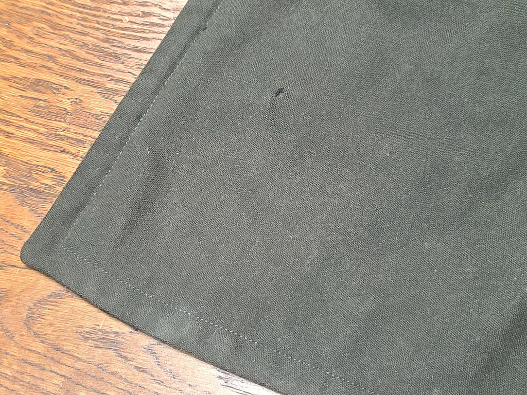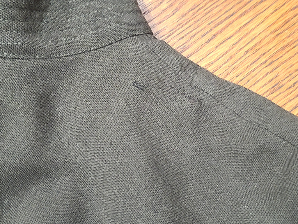 Army nurse caduceus pin and first lieutenant rank pins. AS-IS condition with several moth holes. The biggest hole is on the middle right side area and along the hem on the bottom. These are not "through" holes as there are two layers of wool. If you had the right color thread, you could probably sew it in a way to make it less noticeable (I, unfortunately, do not have the right color thread here). Even with the holes, I think it would still be find to wear at events of display on a mannequin.