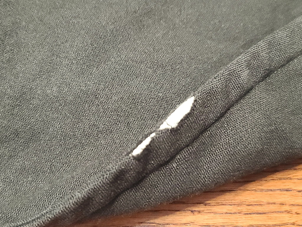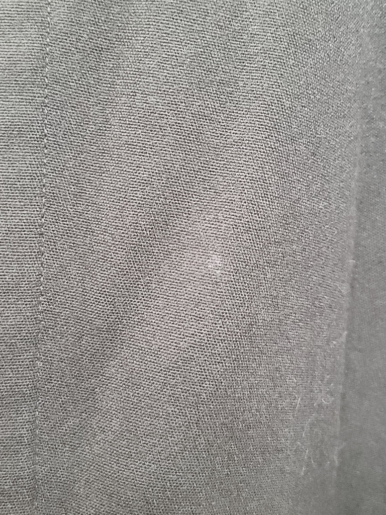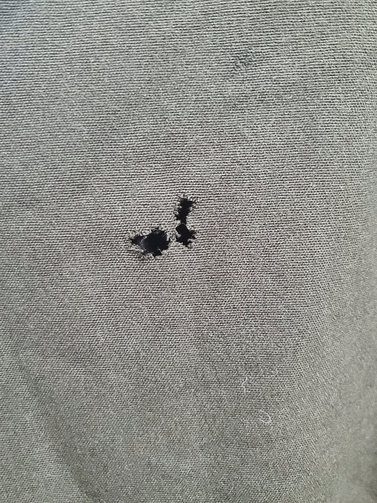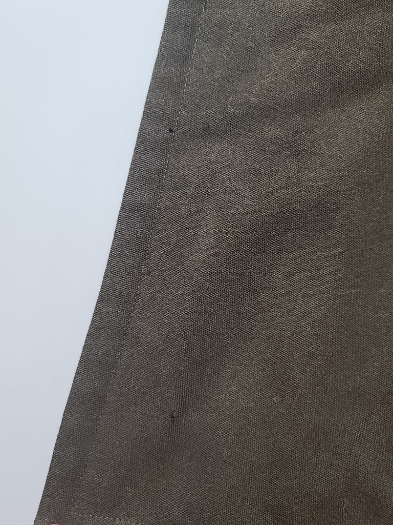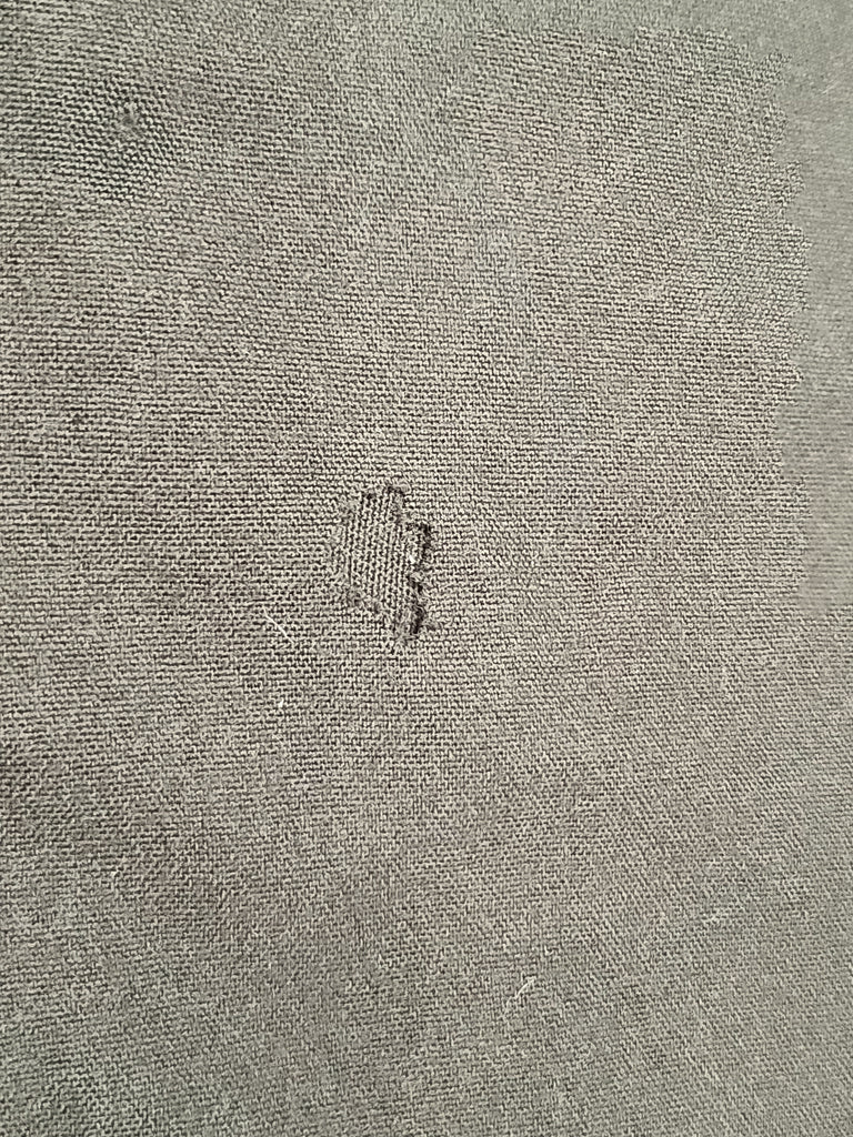 Army nurse caduceus pin and first lieutenant rank pins. AS-IS condition with several moth holes. The biggest hole is on the middle right side area and along the hem on the bottom. These are not "through" holes as there are two layers of wool. If you had the right color thread, you could probably sew it in a way to make it less noticeable (I, unfortunately, do not have the right color thread here). Even with the holes, I think it would still be find to wear at events of display on a mannequin.