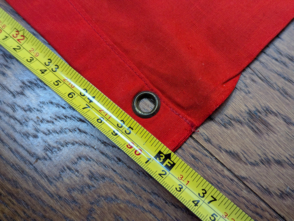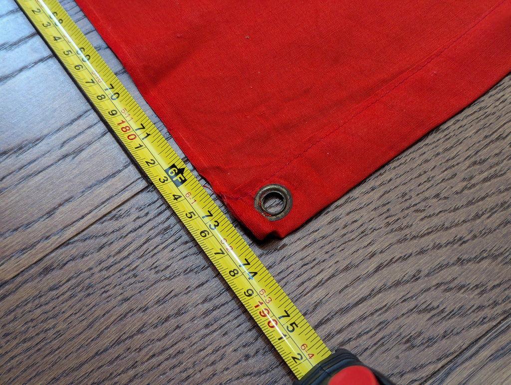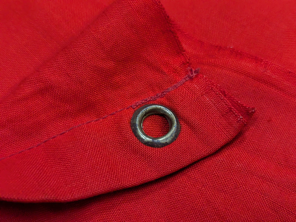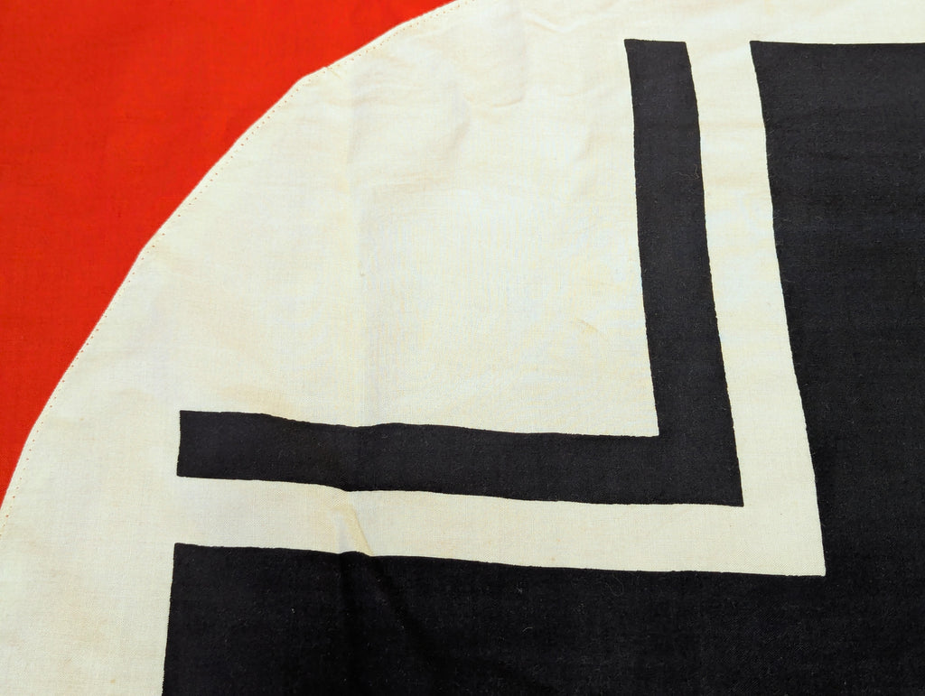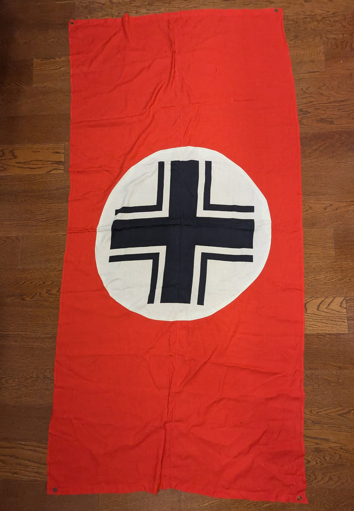 Very nice original example of the vehicle identification flag which has a Balkenkreuz rather than a swastika. It is one sided as it is only meant to be stretched over a vehicle, so that friendly aircraft will know not to bomb or strafe you. Typically seen in original photos on the engine deck or turret of panzers. It has metal gromets, one each corner. The grommets look brass but they are a coated steel. The Balkenkreuz is screen printed on white which is sewn to the red background.  This is a very nice example with just a few small stains and holes. The color is still quite vibrant.