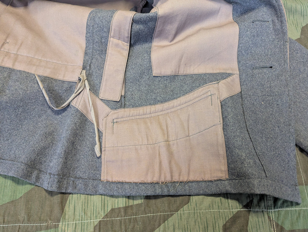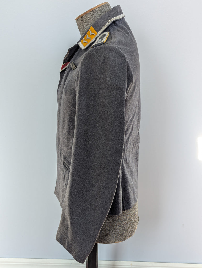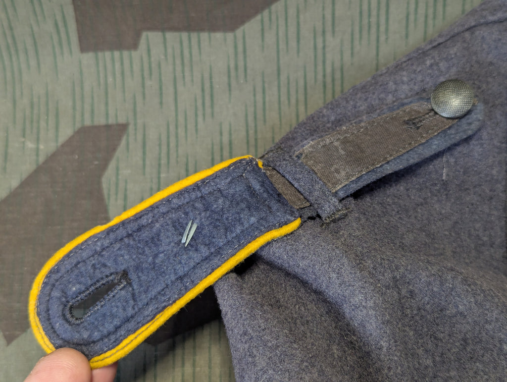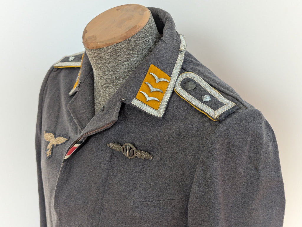 Original Luftwaffe M40 Fliegerbluse with a silver grade frontflugspange für Kampf und Sturzkampflieger and Iron Cross ribbon. Yellow waffenfarbe was used for any personnel that actually used aircraft, so it included pilots, aircrew, and Fallschirmjäger. The tunic was cut down by the original wearer, as was common. A few inches were removed from the bottom edge of the tunic. This was done for the look and also the function of it. The collar tabs and tress appear to be originally applied. The eagle and iron cross are possibly reapplied, but are still original pieces. The eagle is a rather nice embroidered early droop tail example. The boards are also original. The tunic has some damage and some repairs, mostly around the neck and collar. I had this tunic on a mannequin for a few years and it does display quite well. Its much better looking than many similarly priced tunics.