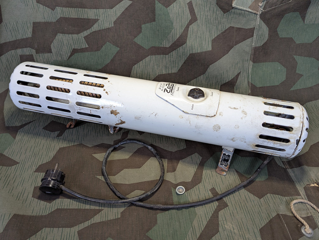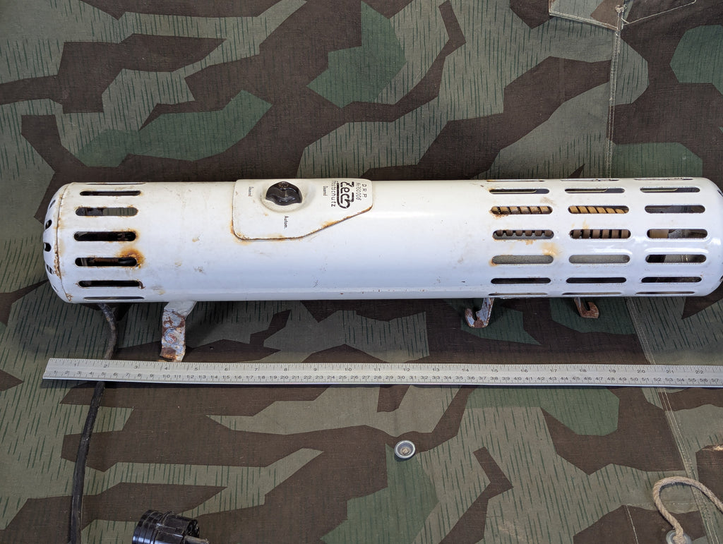 Do you ever buy something then wonder why do I own this? then look at it again and think I would do it again. Original German Zech D.R.P. electric space heater made from enameled steel. It does not work! The cord is also damaged enough that is would immediately arch if plugged in, so just don't. Maybe you could rewire or rebuild it. Electric heaters were common in Luftschutz bunkers, as they did not use up any of the oxygen from the bunker to work. The enamel has some chips. I just think this thing is neat and if used in the right display area it would be pretty hot.