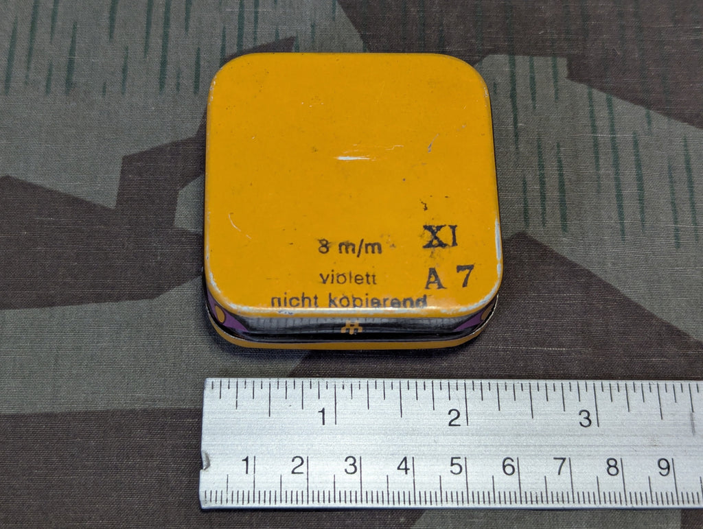 Very nice, colorful pre war OSO Schreibband typewriter ribbon tin in rather good condition. This is very art deco looking and the shop address falls in what became East Berlin. The paper inside goes into more detail on the typewriter ribbon. Apparently the ribbons were sold based on how hard the machine could strike the letters when typing, weak, middle, strong. OSO was appropriate for all.