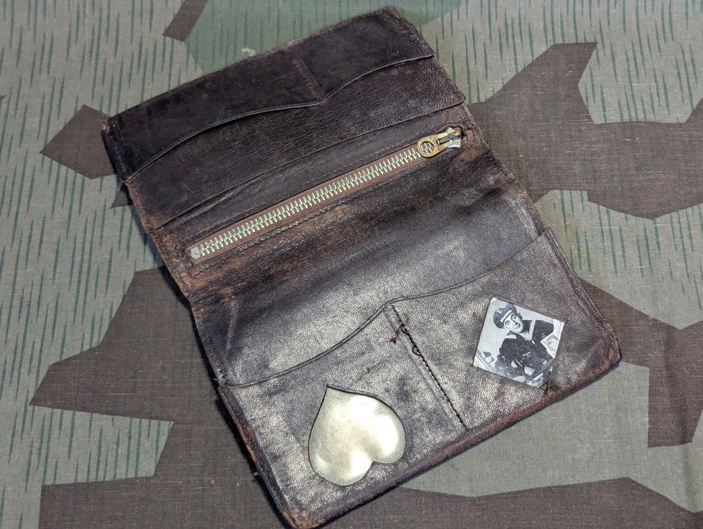 Original leather souvenir wallet from the Eifel tower in Paris with a Kriegsmarine sailors photo inside. The leather has damage and a lot of the stitching has failed. It could be useable again, but you would need to restitch it. Practically all of the stitching has come undone, which is bad, but in terms of putting it back together it might make the process a little easier. Still a rather nice occupied Paris item.