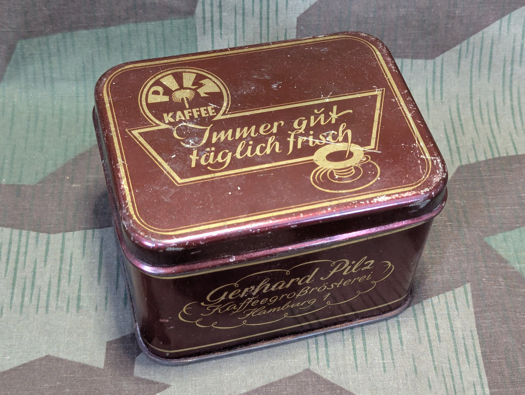 German Pilz Kaffee sales tin. It has some wear. I like the graphics. The style of the tin is typical for the 1940's. The business was first registered in 1939. They did continue to sell coffee post war, but the packaging changed significantly.
