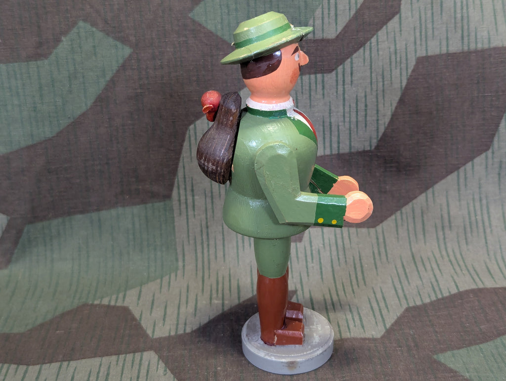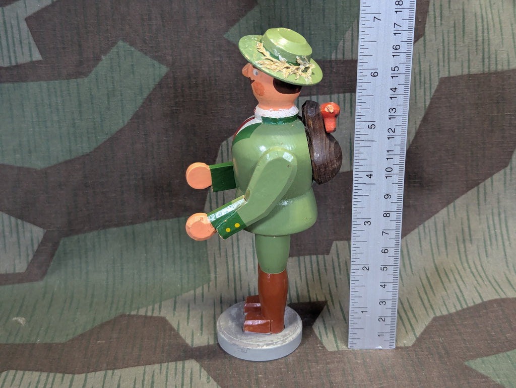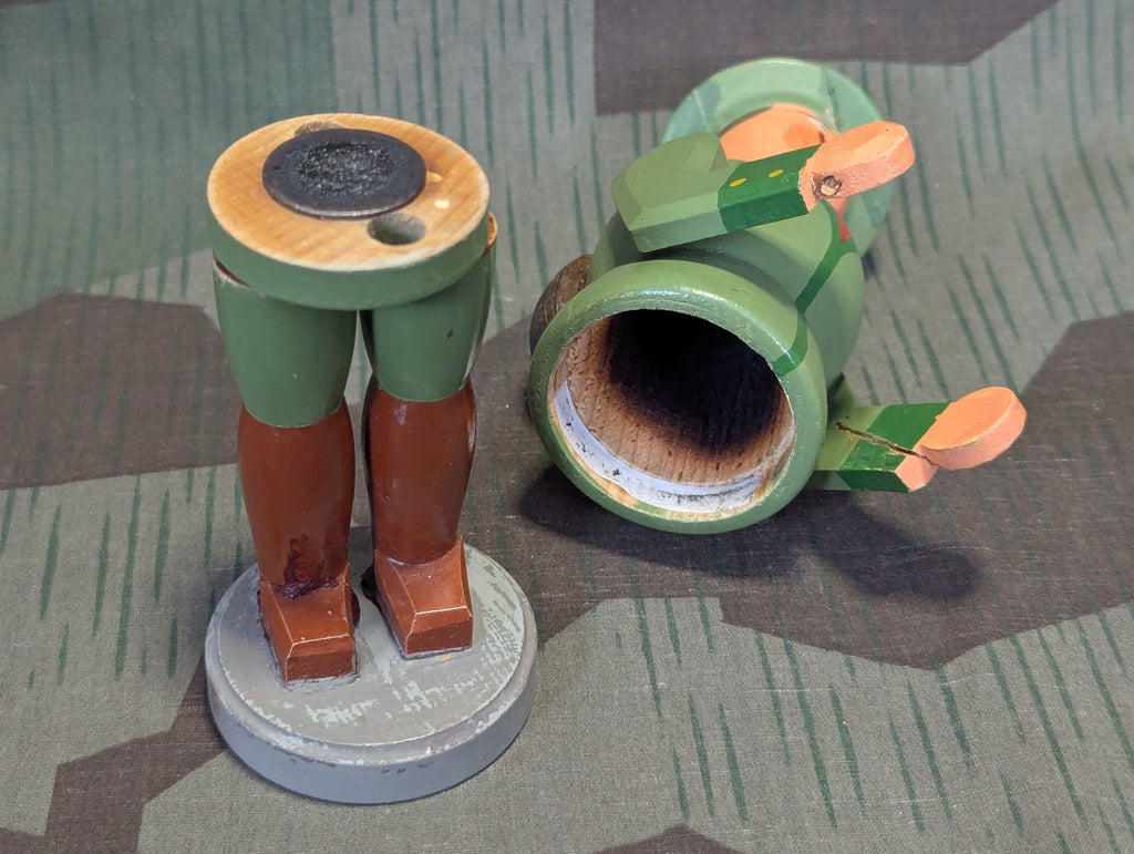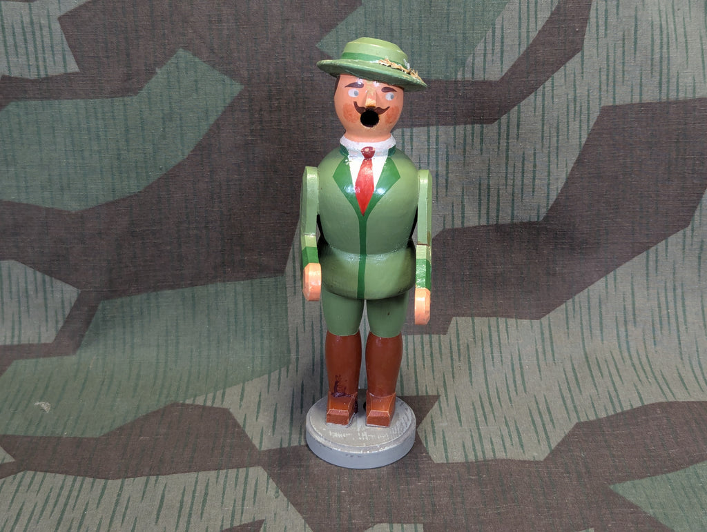 Räuchermännchen are a very old German knick-knack tradition that dates back to around the mid 1800's. They originated in the Erzgebirge, but have spread throughout Germany and are now a staple of German Christmas markets. These were made in the same region where many WHW items were produced. This region was known for many crafts, mostly made from wood. They are essentially a kitschy incense burner, with the smoke coming out his mouth. Never compete with the Germans for cute doo-dads. All of the energy they save on humor goes into this field.