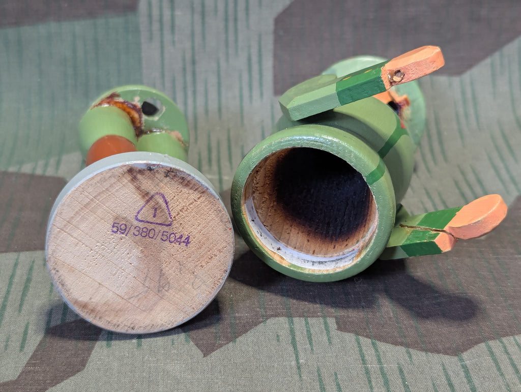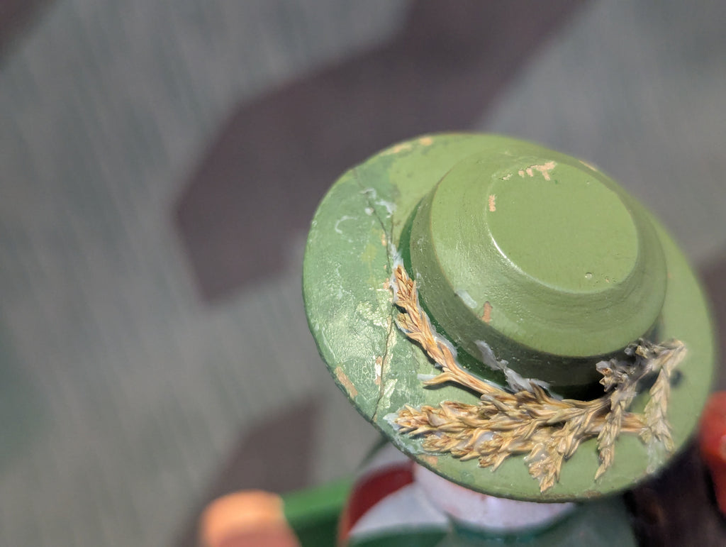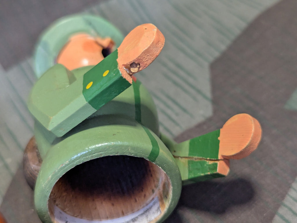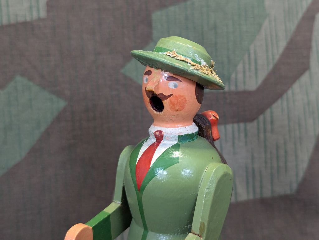 Räuchermännchen are a very old German knick-knack tradition that dates back to around the mid 1800's. They originated in the Erzgebirge, but have spread throughout Germany and are now a staple of German Christmas markets. These were made in the same region where many WHW items were produced. This region was known for many crafts, mostly made from wood. They are essentially a kitschy incense burner, with the smoke coming out his mouth. Never compete with the Germans for cute doo-dads. All of the energy they save on humor goes into this field.