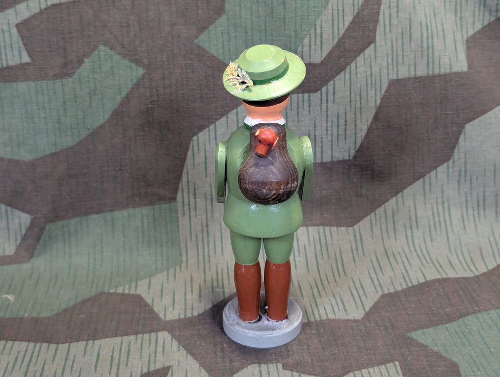 Nice older Räuchermann, smoking man, dressed as a forester with a little Dackel dog sticking out of his rucksack. Förster used dachshund (literally "badger dog") to hunt badgers and other burrowing animals. This one is early DDR and actually has a maker stamp on the bottom. The brim of his hat has been repaired. He has some general wear and it lightly used. Comes with a small bag of mixed scent incense cones (Weihnachtsduft, etc.)