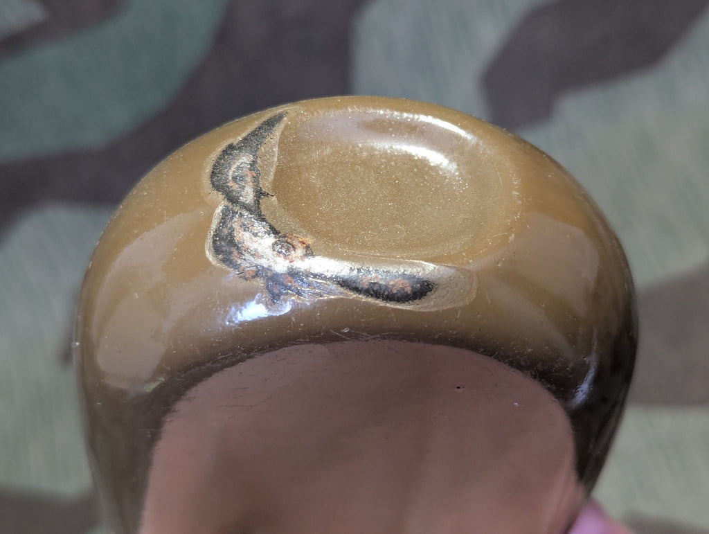 Original 1934 Czech army enameled steel canteen. I find a lot of these in Germany, they seem to have been issued to the Wehrmacht late in the war or at least to rear line units. They acquired many of them when they occupied Czech and the Slovak forces that fought alongside the Wehrmacht did use them. This one is in fairly good condition with its cork and the bits of string that hold that on. There is a chip in the enamel on the base and some minor chips elsewhere.