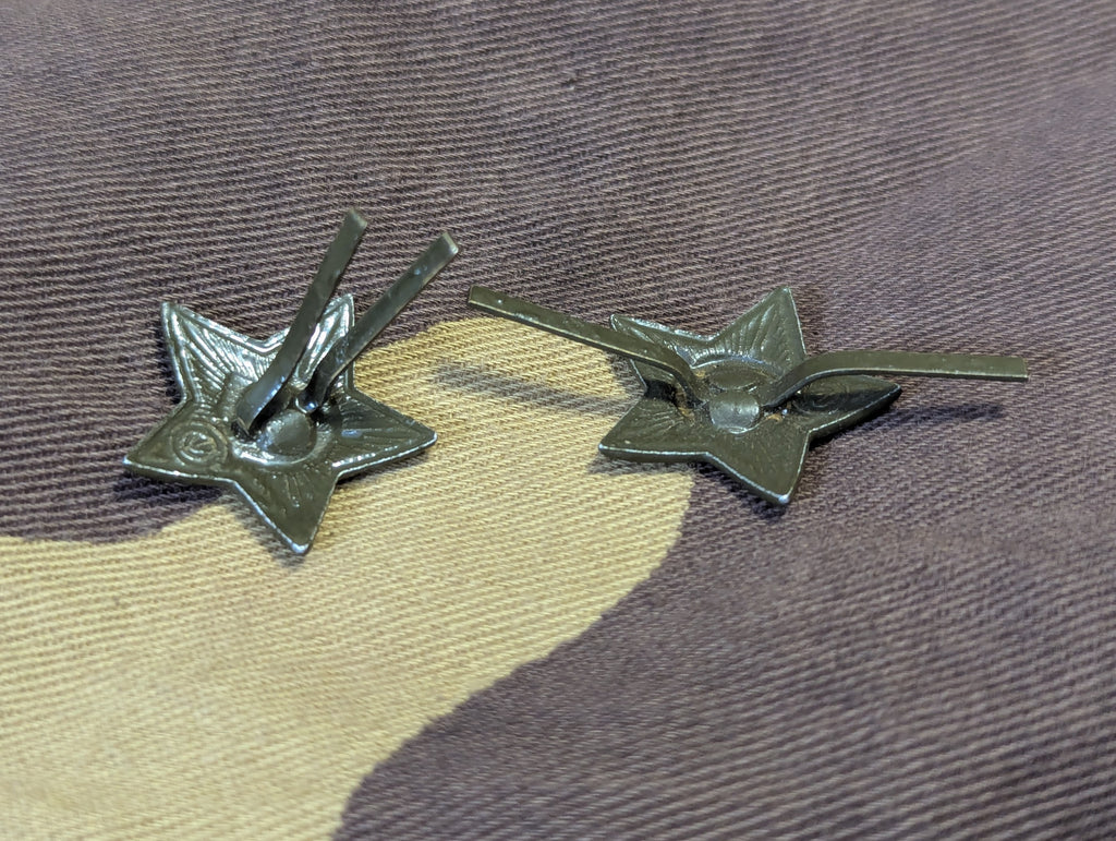 Green painted metal Soviet hat star. Price is for one. This is the smaller of the cap stars for garrison caps, etc. Postwar made, but still usable for WWII. They do show overall general wear and aging.