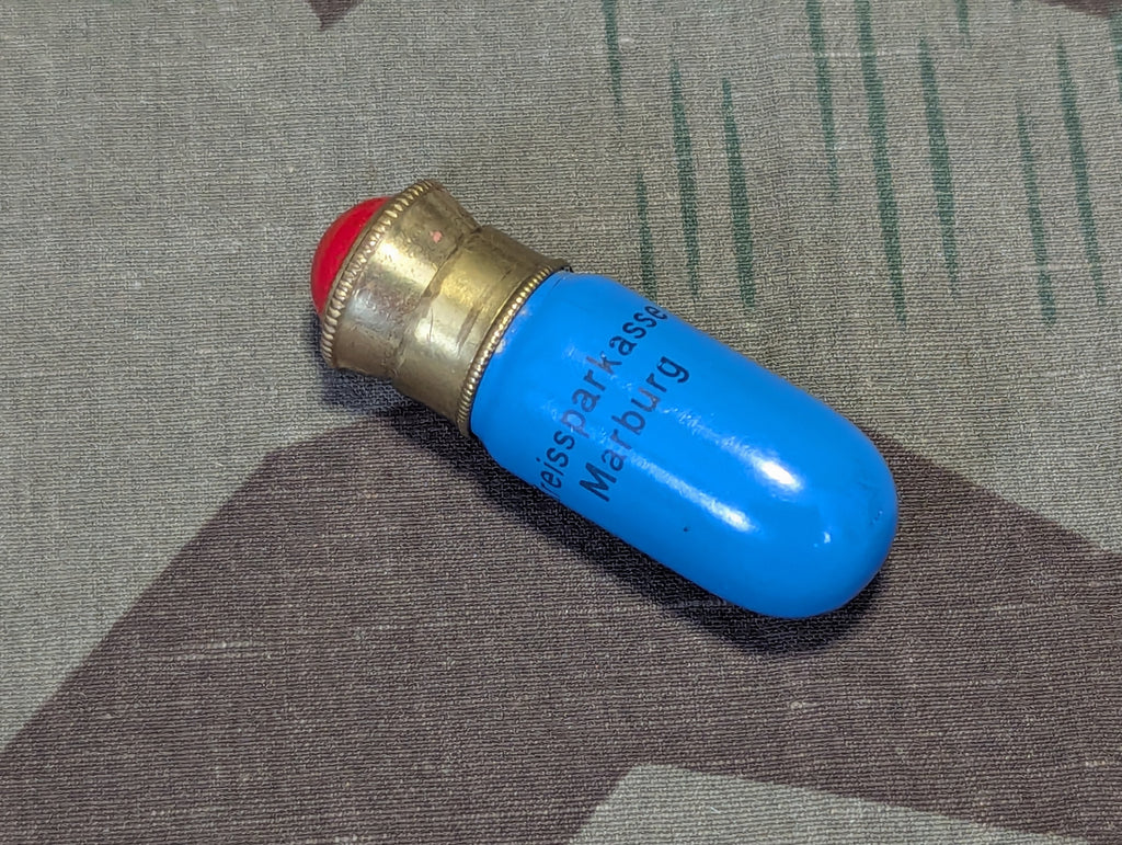 German small metal container with advertising for the bank of Marburg on it. I am thinking this is for sewing needles but it seems a bit short for that, so maybe it was for something else, snuff maybe. I am really not entirely sure. The style of this is more WWI era. In decent condition.