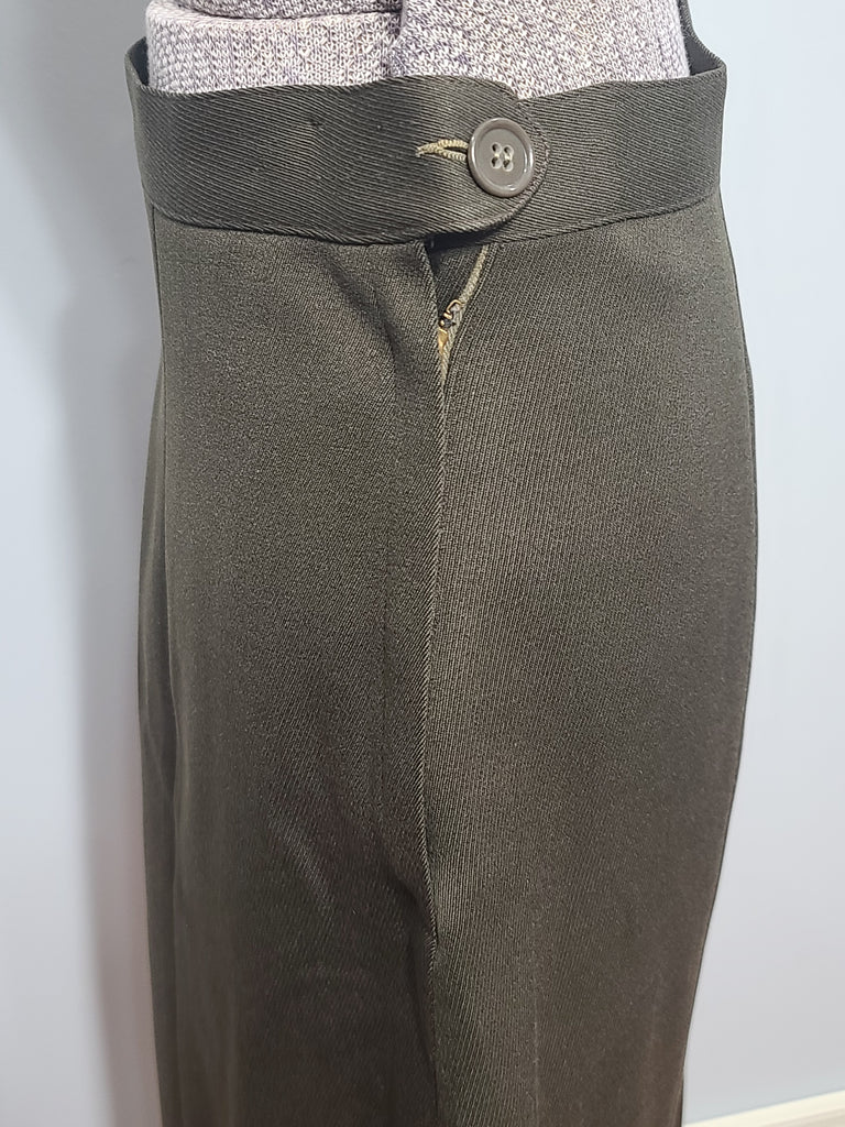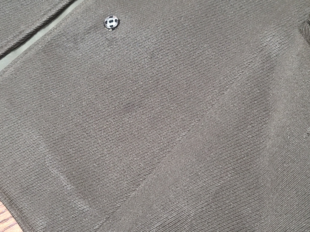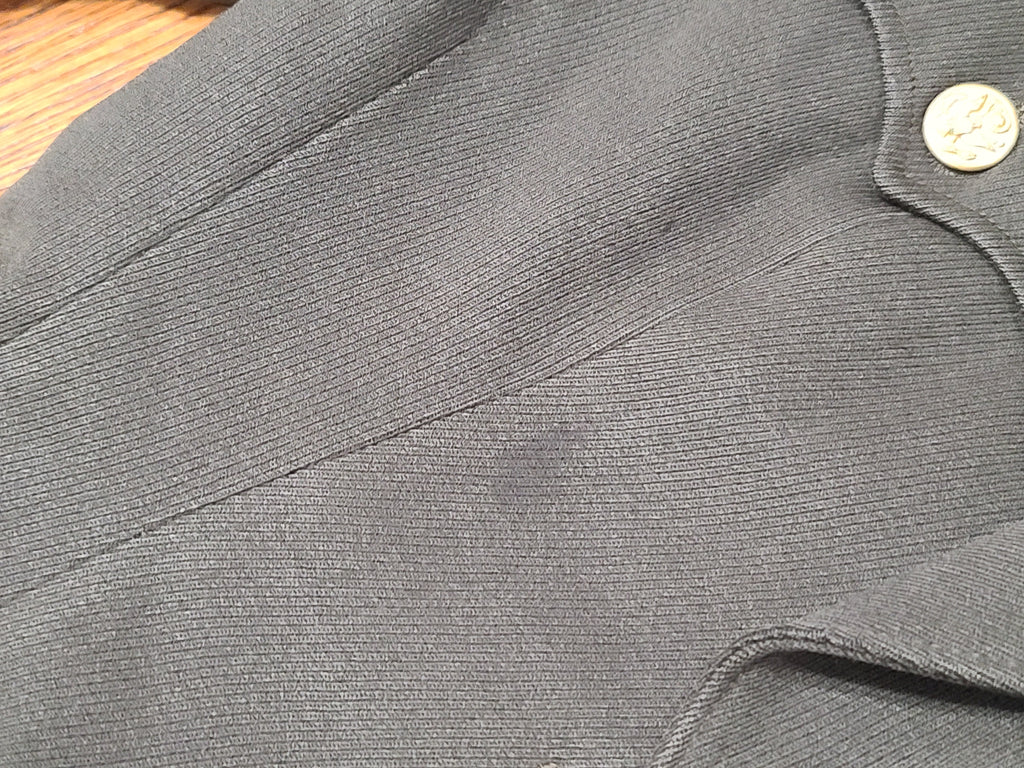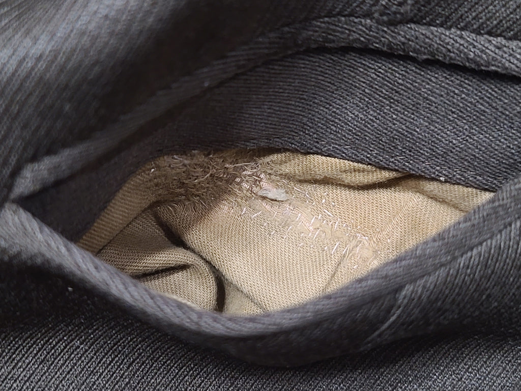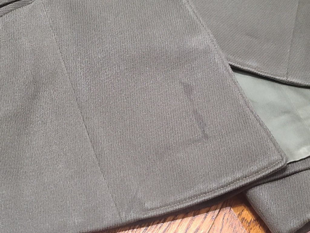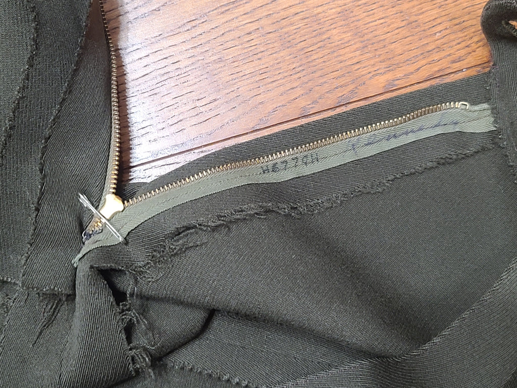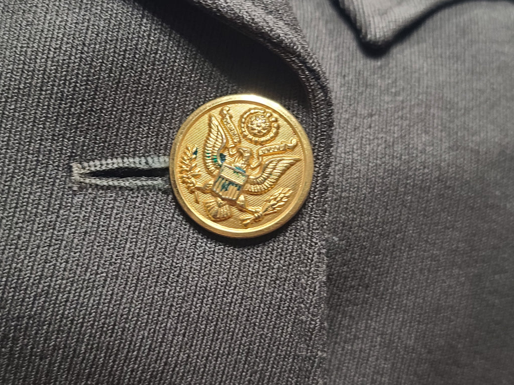 There are some darker spots on the jacket (the stains are more visible at certain angles - the aren't as noticeable on the mannequin, but are more obvious when the jacket is laying on the floor). Some blue-ish oxidation on a few buttons and wear on the buttonholes. The ribbon bars show some discoloration /aging. Some wear on the inside collar. Repairs on the inside of the pocket. The button looks to have been moved out on the skirt a bit. The zipper is broken at the bottom and is safety pinned at the bottom so it still zips.