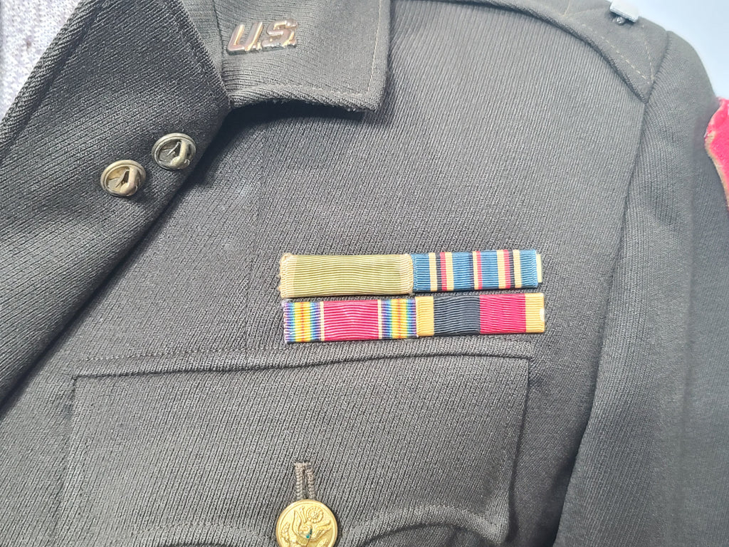 Tailor made set. K. Lear Tailor Chattanooga, Tenn. label. Heavier weight wool. 15th Army Group patch (they were mostly active in Italy). The ribbon bars are: WAC, American Campaign, Victory Medal, and Army of Occupation. Flat back pinbacks. First lieutenant rank pins.