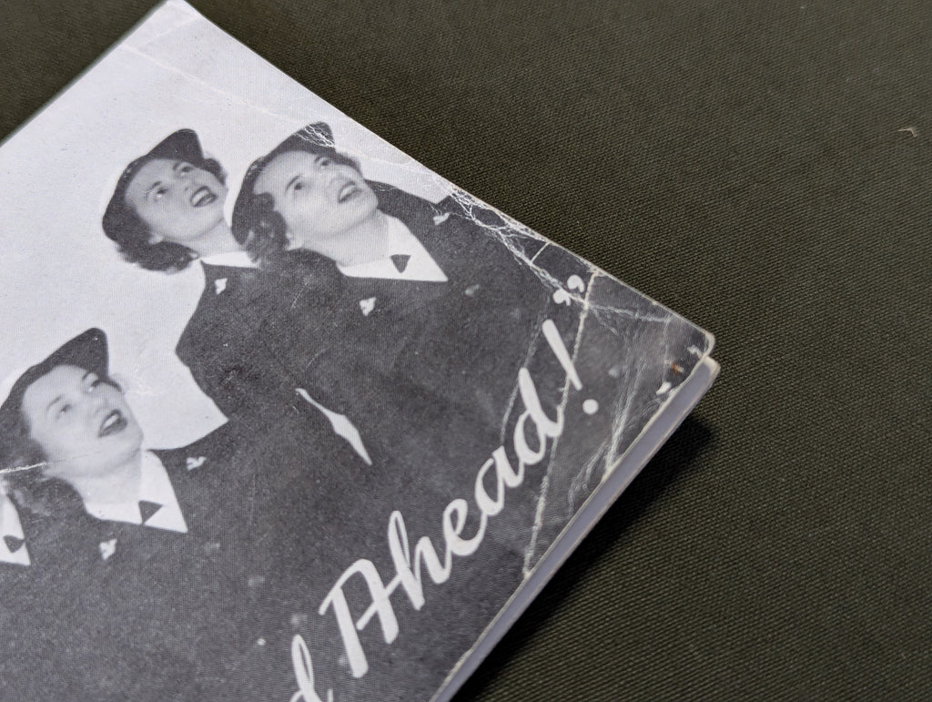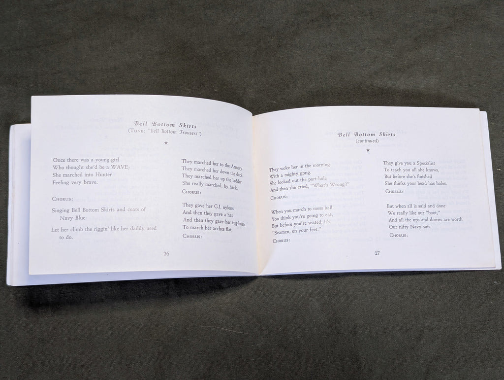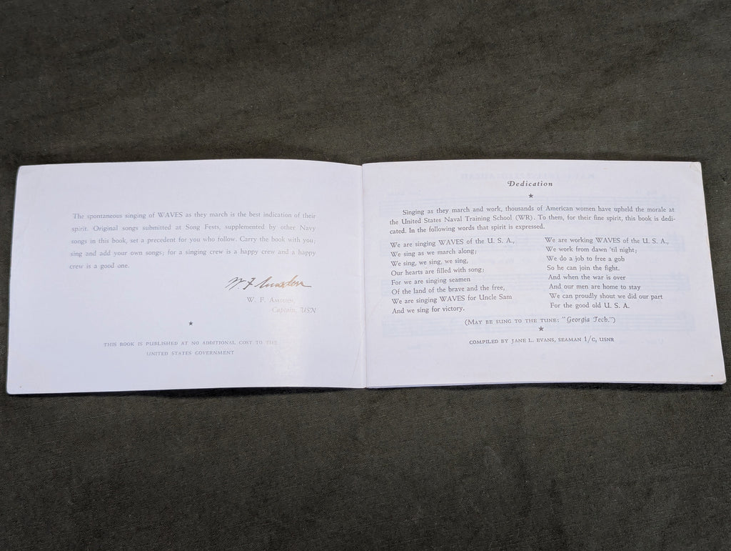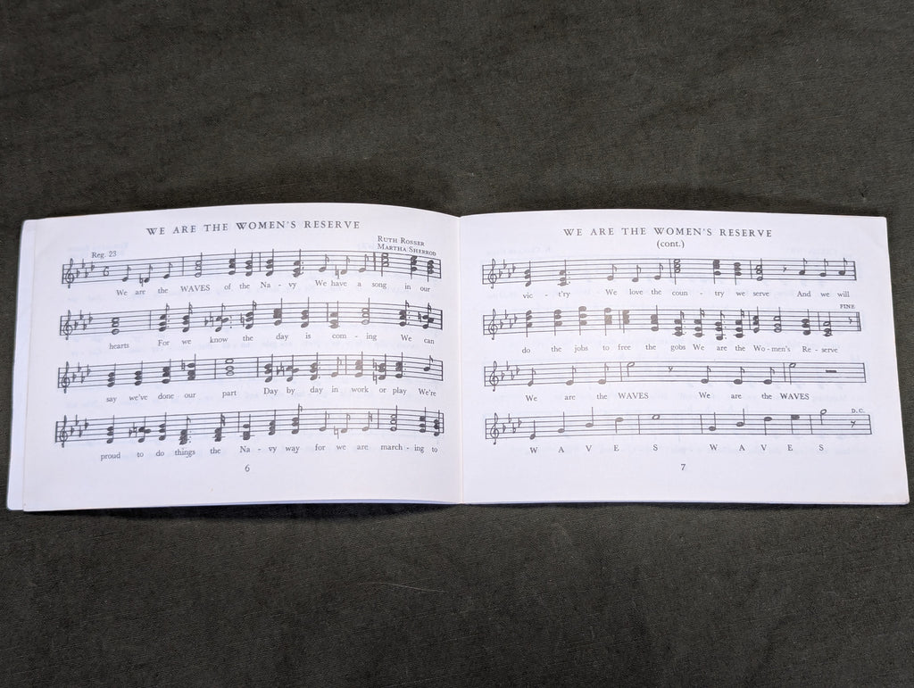 Original WWII US Navy WAVES women's song book, "Navy, Full Speed Ahead!". Unfortunately, the booklet does not have a date, but it is almost certainly wartime. Fairly good condition with some wear. The cover has a few creases. Named on the front to Mary Basko (?)