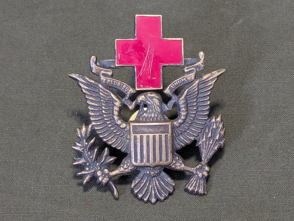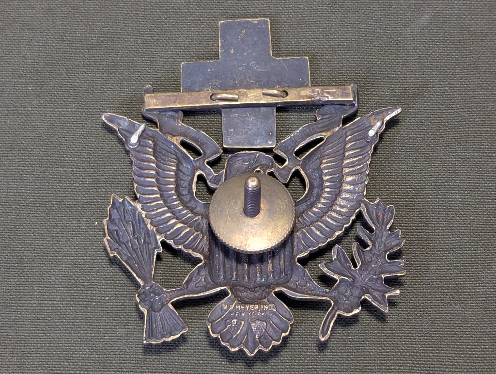 WWI - 1930s American Red Cross screw back men's officer cap badge. Marked NS Meyer Inc. New York. The red cross has some scratches in it. It is a separate piece attached to the eagle and it is a little loose and jiggly. There are 2 prongs on the backside of the eagles wings which were supposed to help keep the eagle properly oriented when installed, but those prongs have been flattened down and it seems like it was intentional. Rather rare piece of insignia.