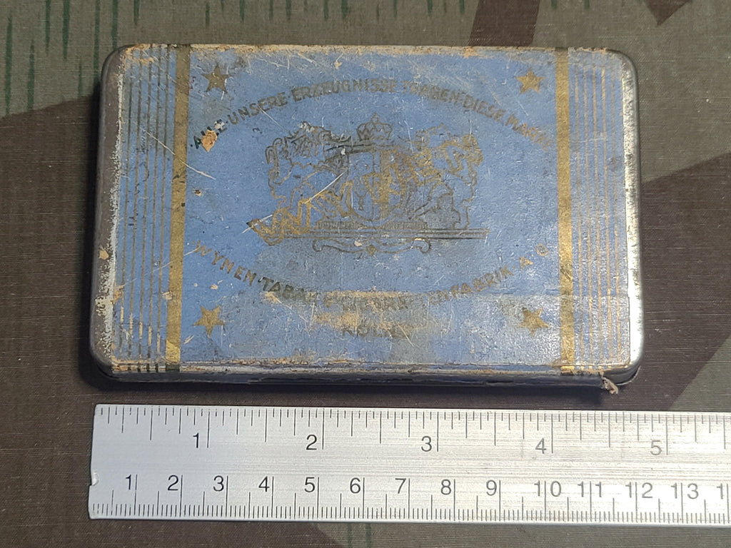 Original Wynen Senat-Türkisch cigarette tin. Paper label on a metal box. AS-IS with some issues. There is some staining and some math written on the top. Some tearing along the edges. Overall general wear.