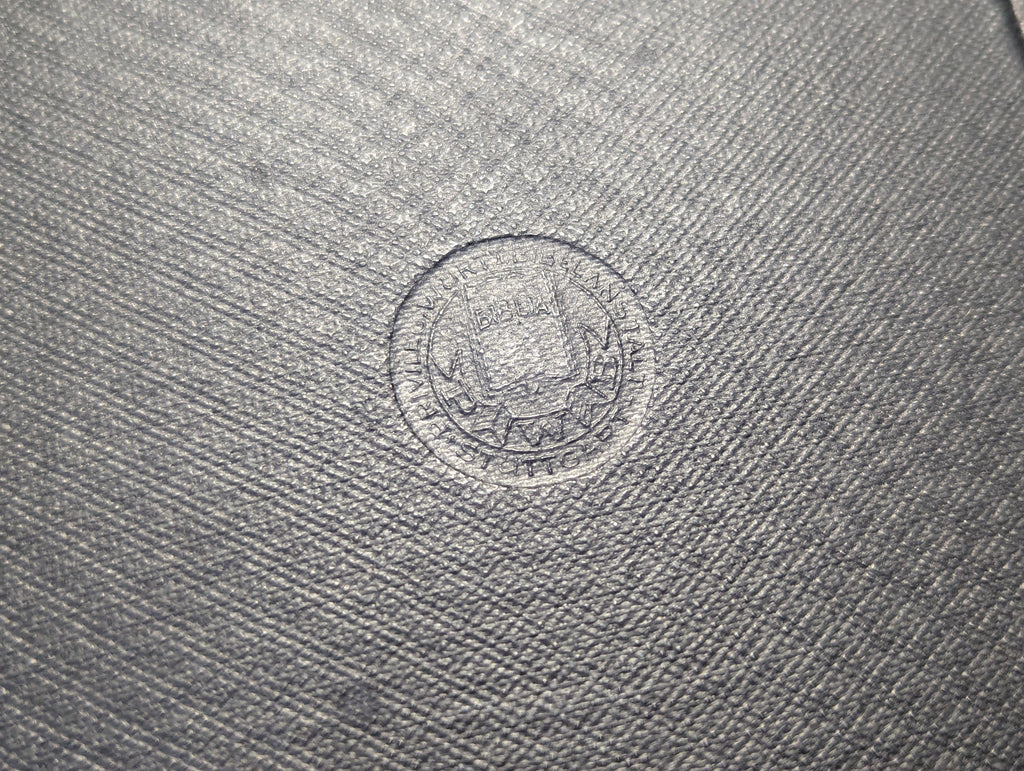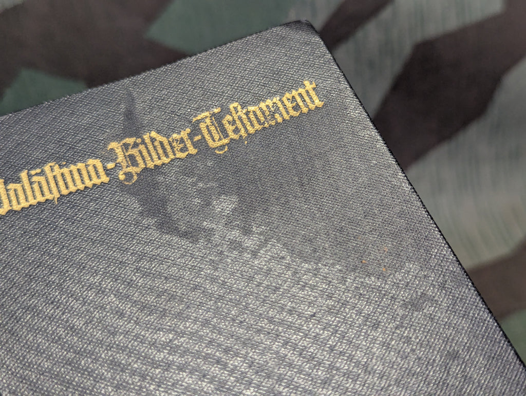 Original 1941 Evangelical Protestant Bible with pictures of the Holy Land. It is supposedly a pocket edition, but it is on the larger end of pocket sized. This one has a name inside as it was gifted in 1942 as part of someone's Confirmation. It is in fairly good condition with a small dull stain on the cover.