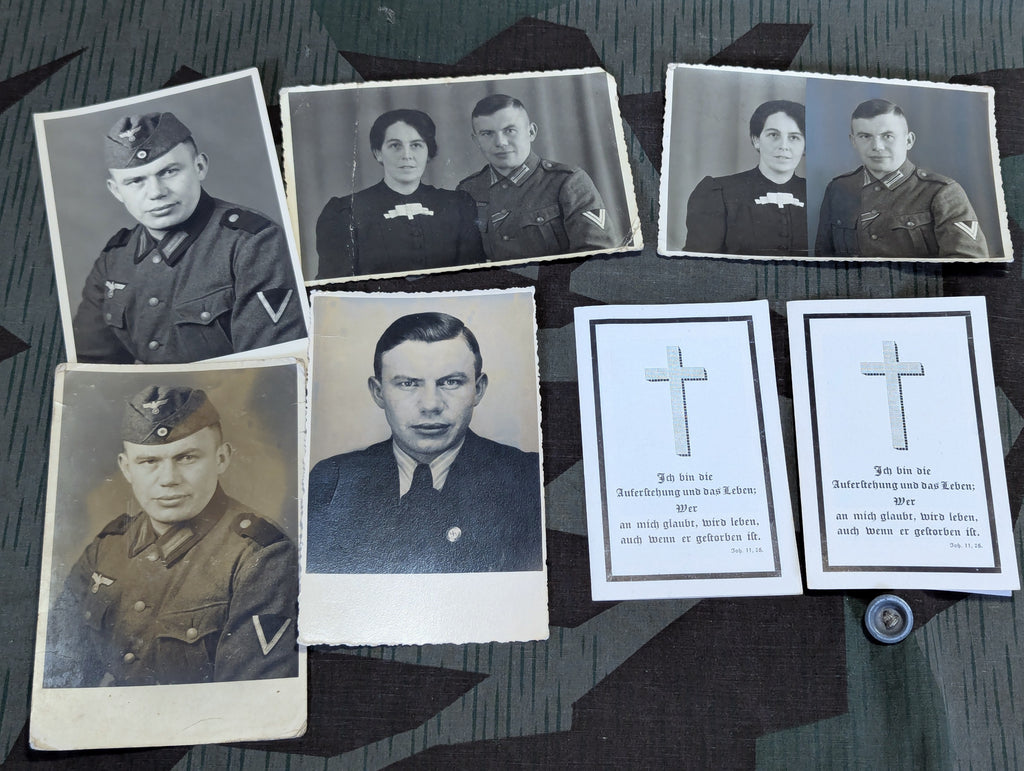Photo and death card lot from August Bous who died in Allied captivity in 1946 at Camp Belfort in France. The writing on the card is interesting. He died from the hardships of war and a broken heart. He did get last rites in Catholic tradition. He may have been executed, but that is speculation on my part as I can not find any information about him apart from what these pictures provide and the wording sounds off. I did find that the church in his hometown still does a prayer for him every ten years or so. He did receive and second class Iron cross and he was a party member. He served in France, Yugoslavia, Russia, and Norway. His civilian photo with his prominent party badge is quite striking. He certainly has the look.