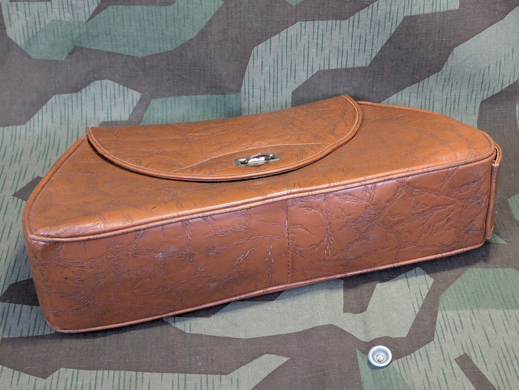 Vintage German imitation leather purse with added compartment for storing your umbrella. The imitation leather is a little rubbery feeling so I am sure the purse itself is rather water resistant. There is some minor wear and age but it is in overall good usable condition. Nice large size purse