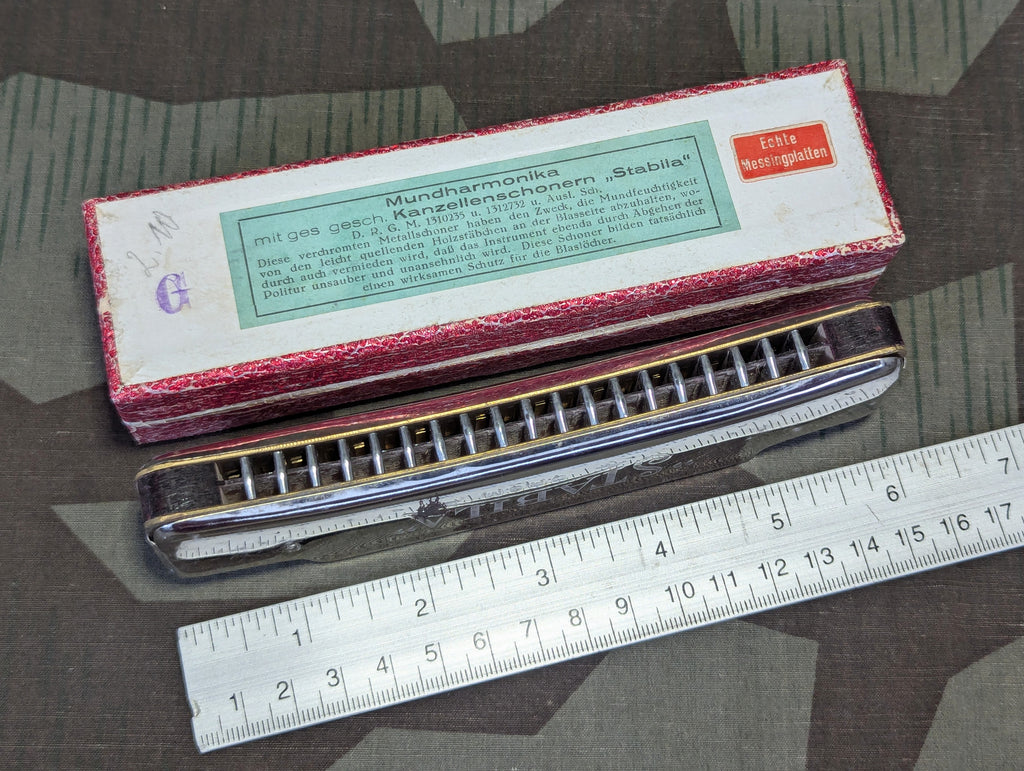 Original German Goldne-Meisterin Stabila Harmonica in G. Marked DRWZ and DRGM. The box seems to have some moisture damage. There is a small rust patch on the harmonica, but otherwise it is in good condition. It was deadstock, so it has never been used.
