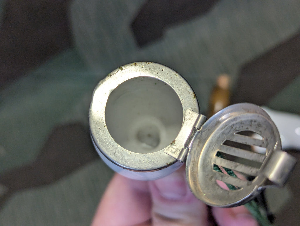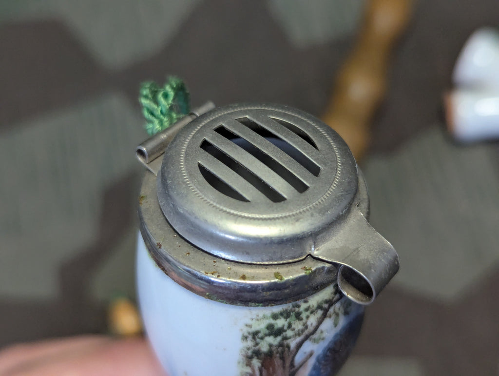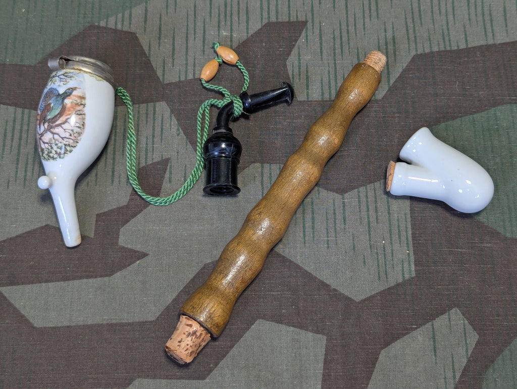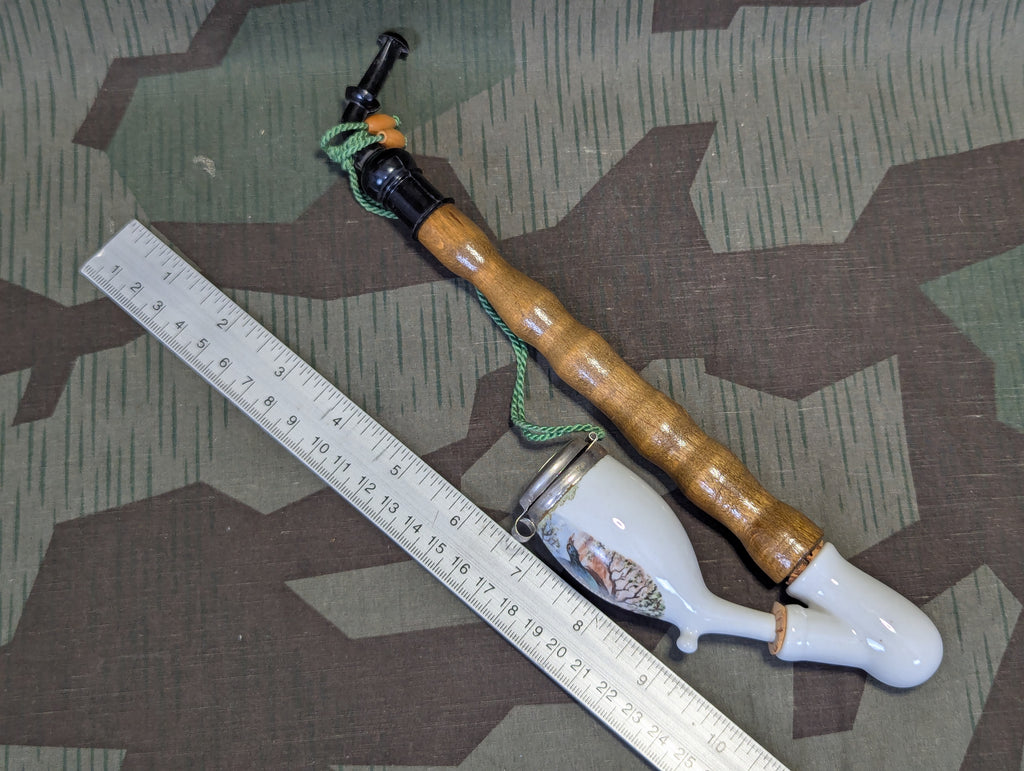Vintage new old stock (not sure how old, exactly) German traditional style multi piece porcelain smoking pipe in good condition. Pheasant motif. The stem is made from wood. The materials are of an older type. The cork has a chip missing. Some light general wear overall.