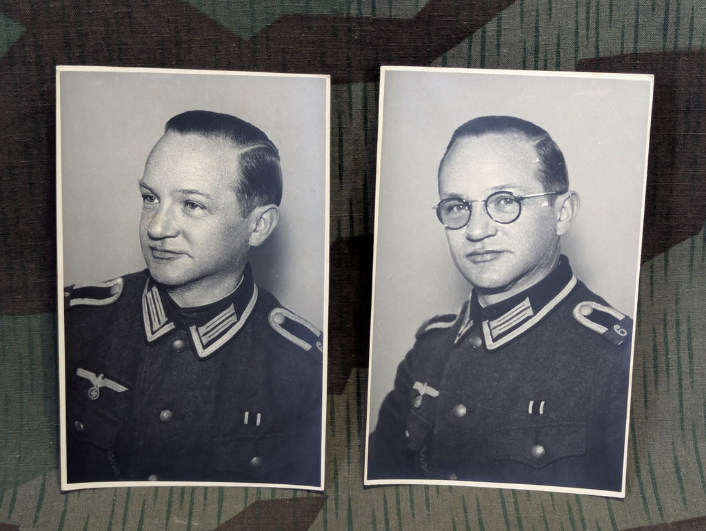 Original soldier's portrait postcards. Lot of two photos of the same man, one with glasses and one without. No writing on the back, but they are postcard sized. Overall good condition.