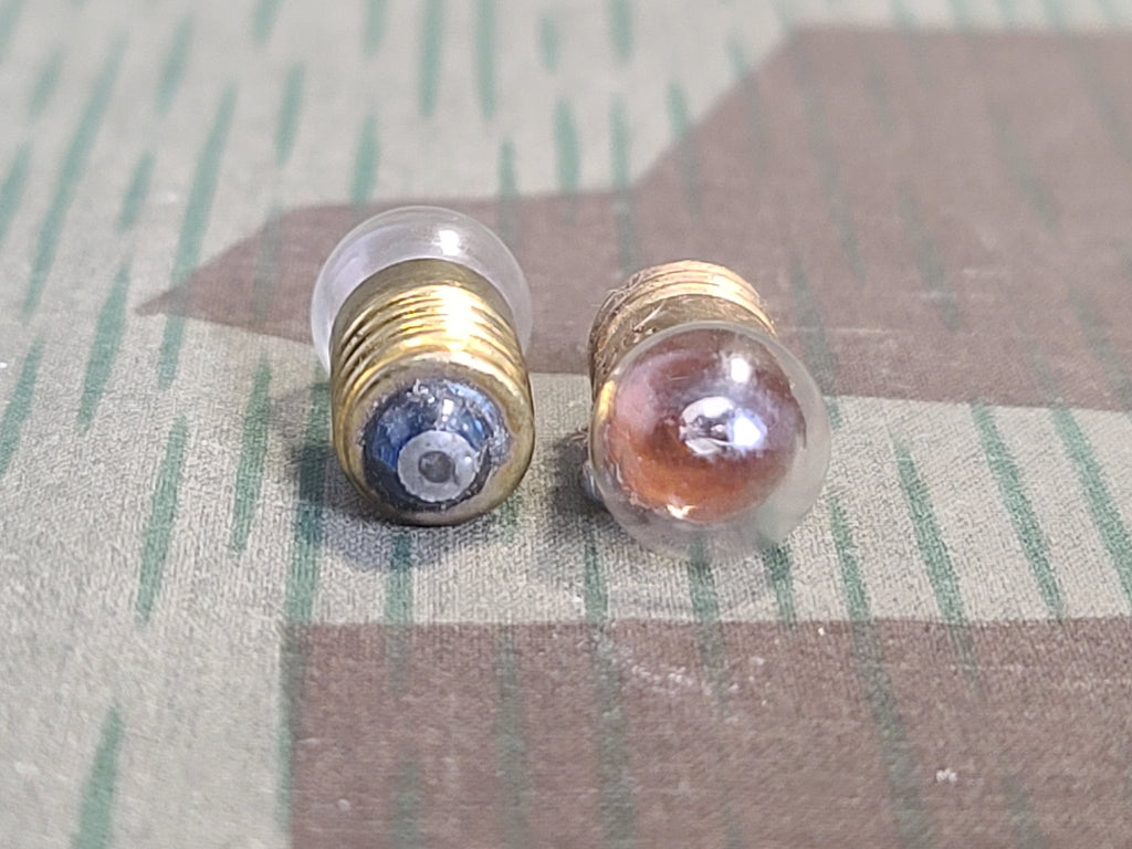 New old stock 6 volt flashlight bulbs. There is no date on the carton or bulbs, but the packaging materials date them to early post war. These will fit virtually any of the standard small German pocket flashlights and the standard flat military-style flashlights and they do produce decent light with the standard 4.5V battery despite being 6V bulbs. Price is for one bulb.