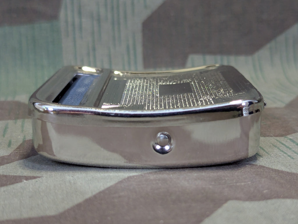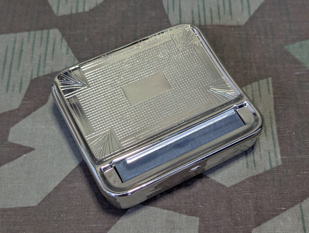 Newly manufactured automatic cigarette rolling machine of the same unchanged design that existed even before WWII. These are very practical items, you can store tobacco, and papers inside and when you want a cigarette just open the tin, tuck some tobacco into the cloth rollers, insert (and lick) the rolling paper to the back of the tobacco and then simply close the tin. A perfectly rolled cigarette will pop out of the top of the tin. The lid has a sort of art deco design. The designs varied widely on these. Shown in period newsreels and in a 1931 advertisement for the same roller.