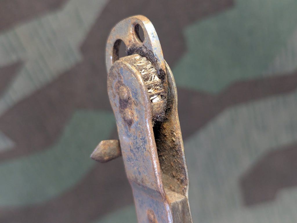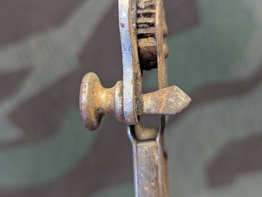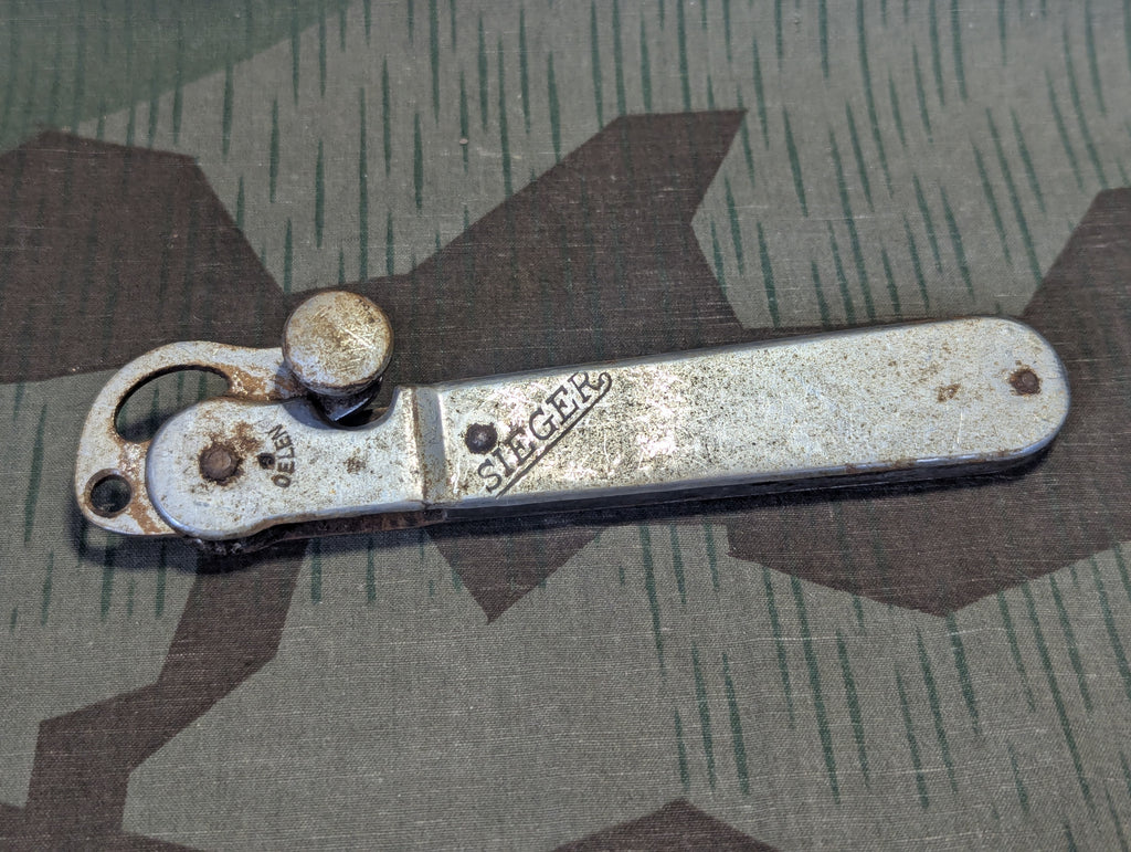 Sieger brand German can opener that works completely different than American types. You force the cutter through the can, then drag it around the edge. This design was popular in Germany for a long time and cheap crappy versions are still available in stores. This is an earlier style, made from steel and wood. It is in OK condition with some wear and rust and it really needs a good cleaning. It is usable and the cutter and teeth are still decently sharp.